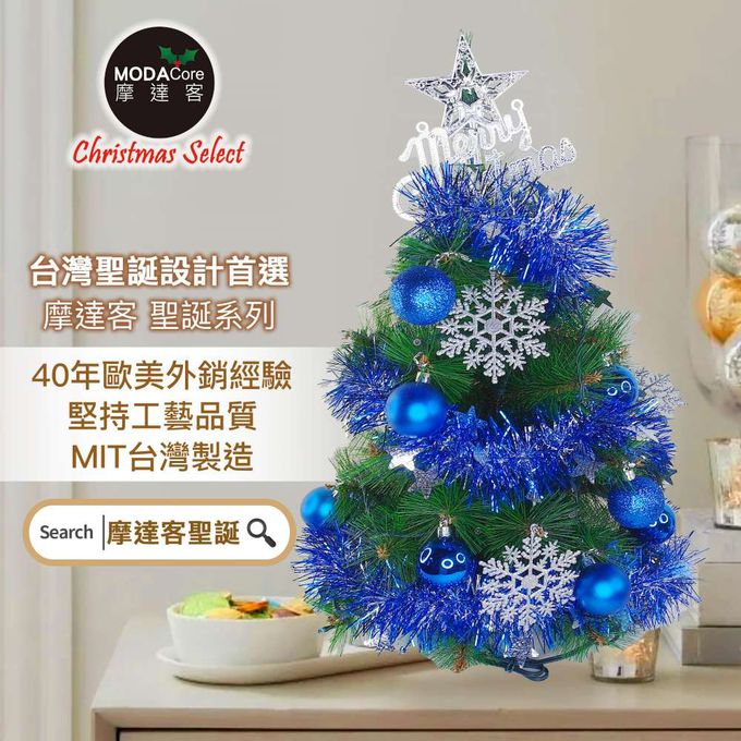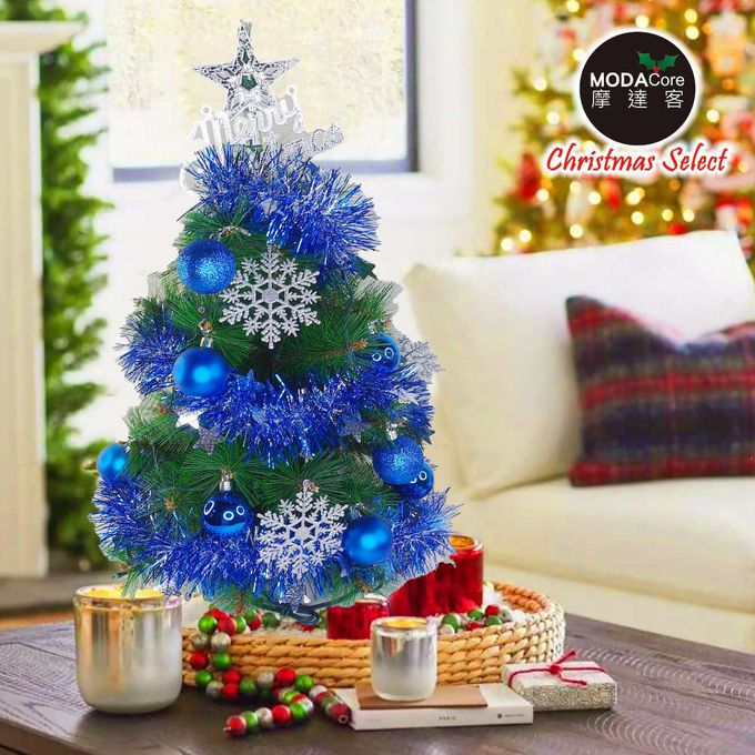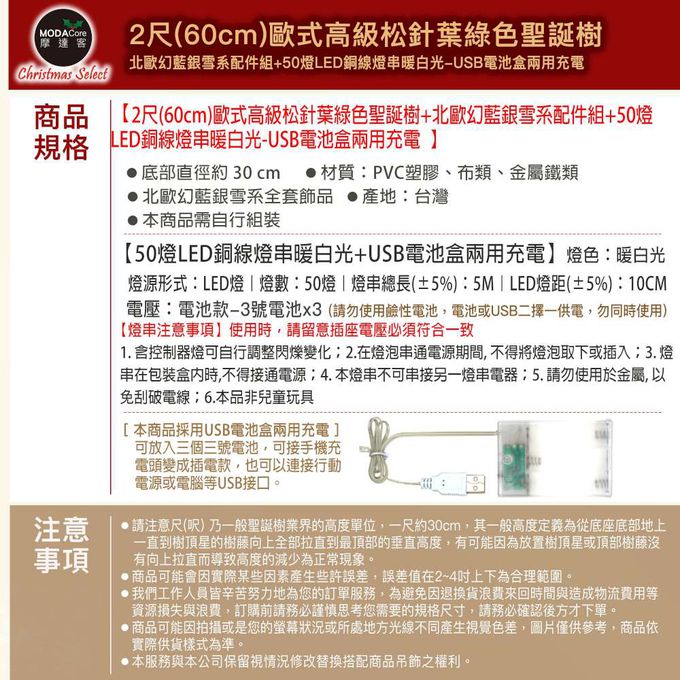 品名:台灣製2尺(60cm)歐式高級松針葉綠色聖誕樹+北歐幻藍銀雪系配件組+50燈LED銅線燈串暖白光-USB電池盒兩用充電 /本島免運費MIT歐美外銷款