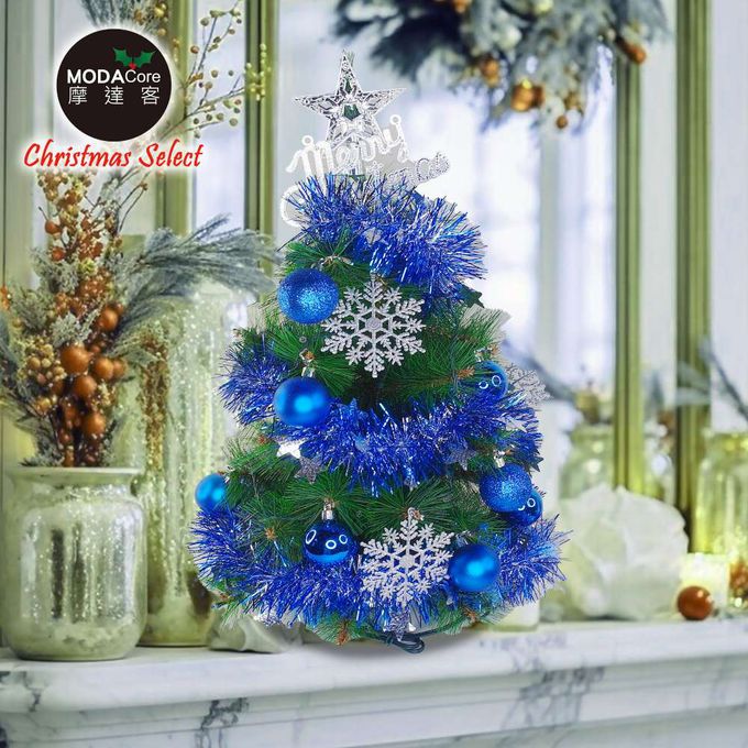 台灣製2尺(60cm)歐式高級松針葉綠色聖誕樹+北歐幻藍銀雪系配件組+50燈LED銅線燈串暖白光-USB電池盒兩用充電 /本島免運費MIT歐美外銷款