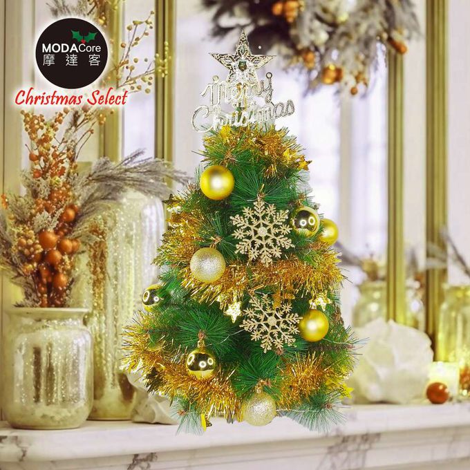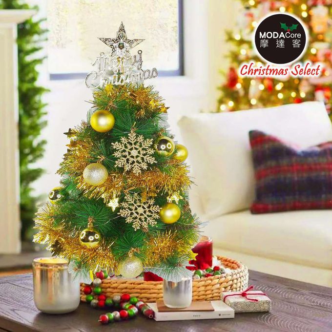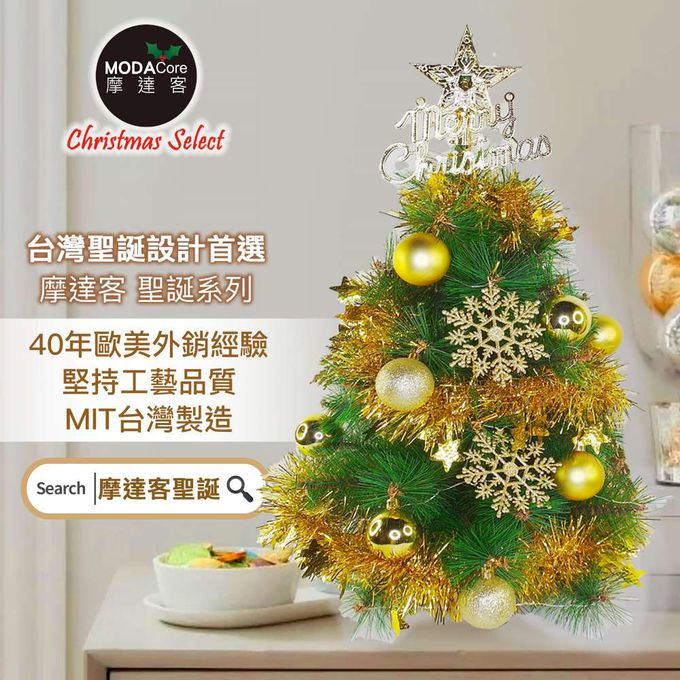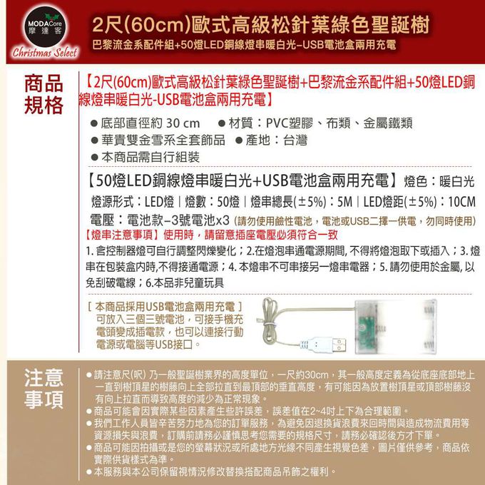 品名:台灣製2尺(60cm)歐式高級松針葉綠色聖誕樹+巴黎流金系配件組+50燈LED銅線燈串暖白光-USB電池盒兩用充電/本島免運費