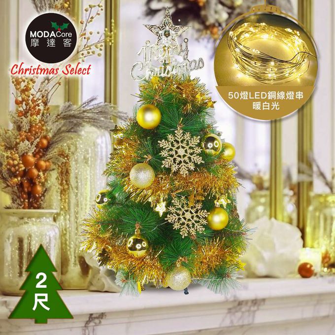 台灣製2尺(60cm)歐式高級松針葉綠色聖誕樹+巴黎流金系配件組+50燈LED銅線燈串暖白光-USB電池盒兩用充電/本島免運費