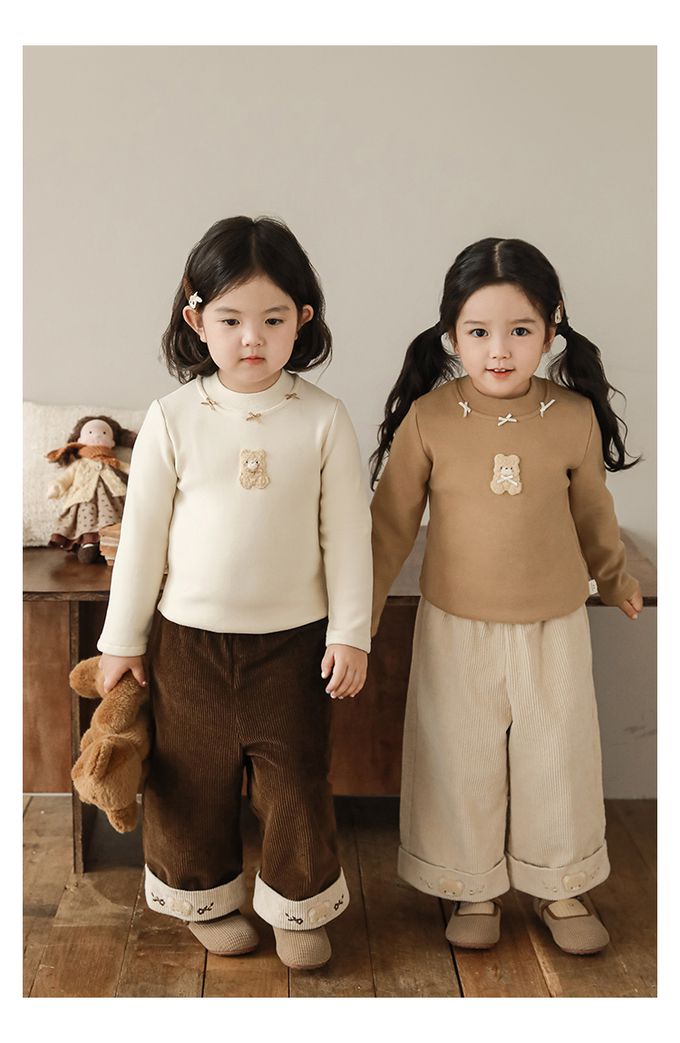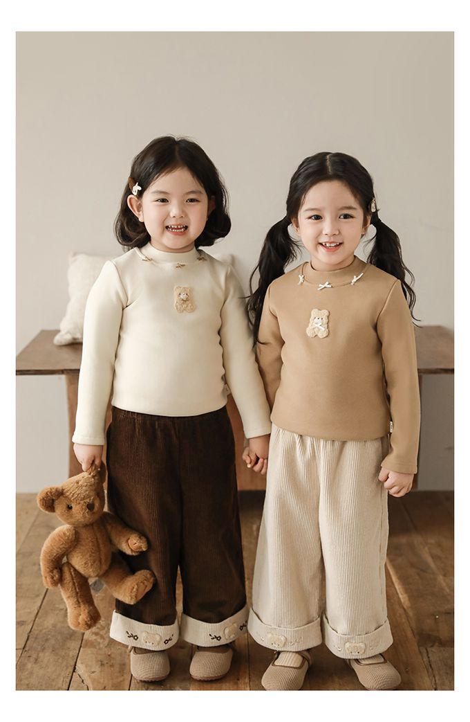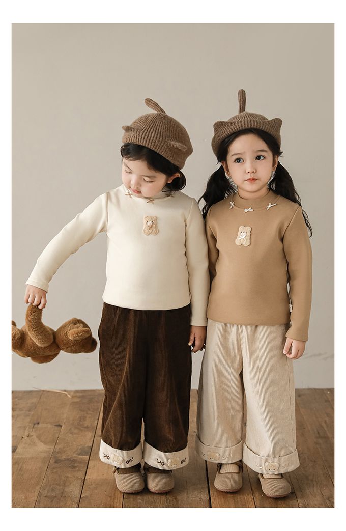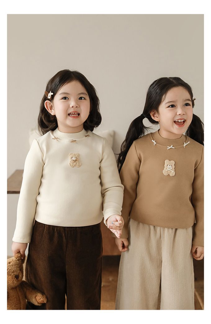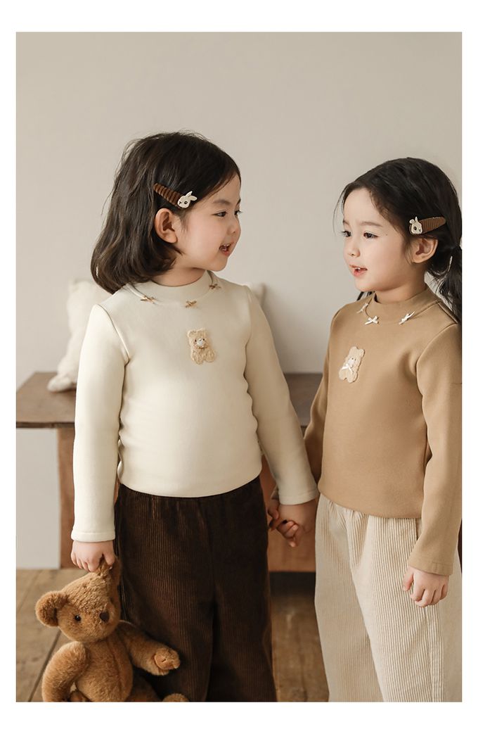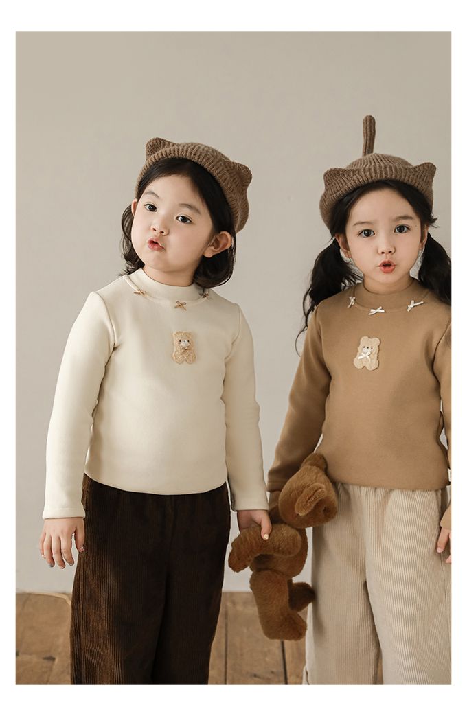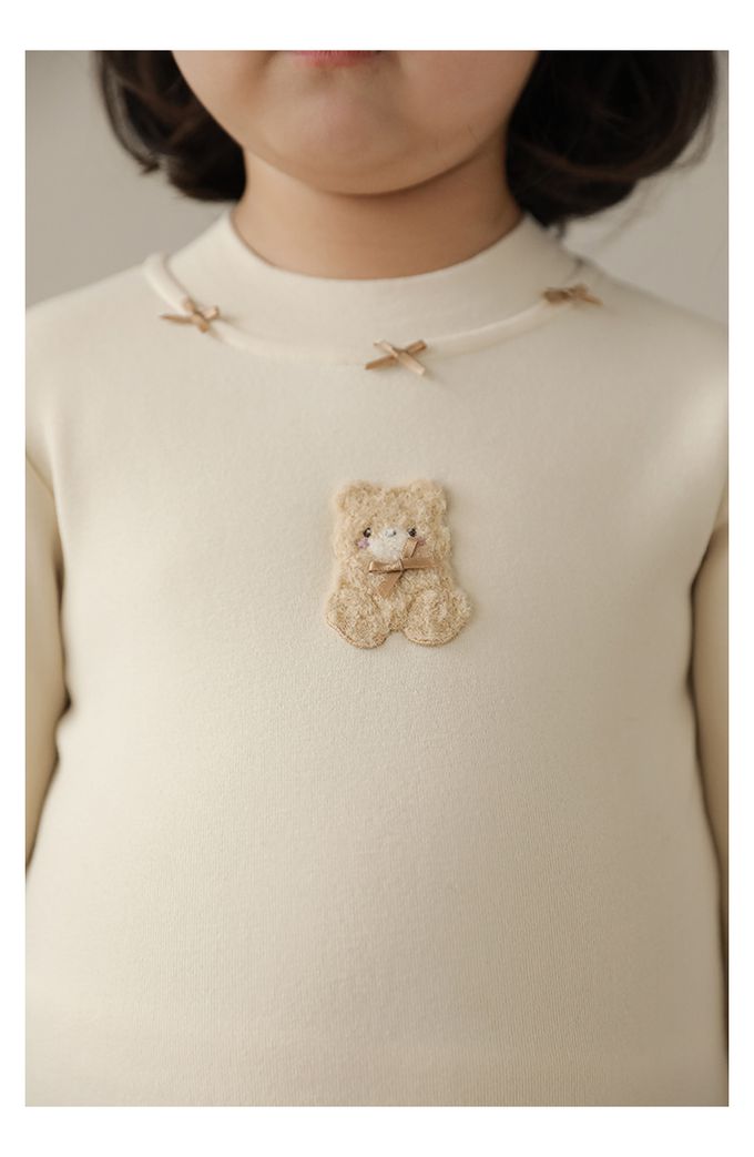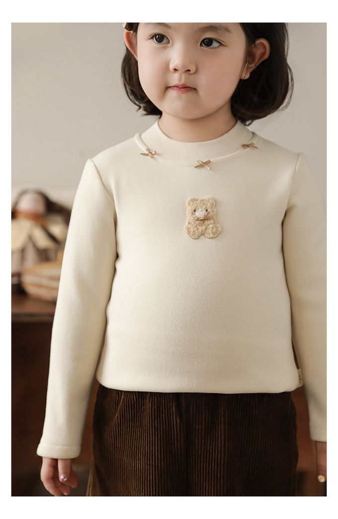 半高領蝴蝶結長袖上衣/內搭衣(加絨)-小熊-米色