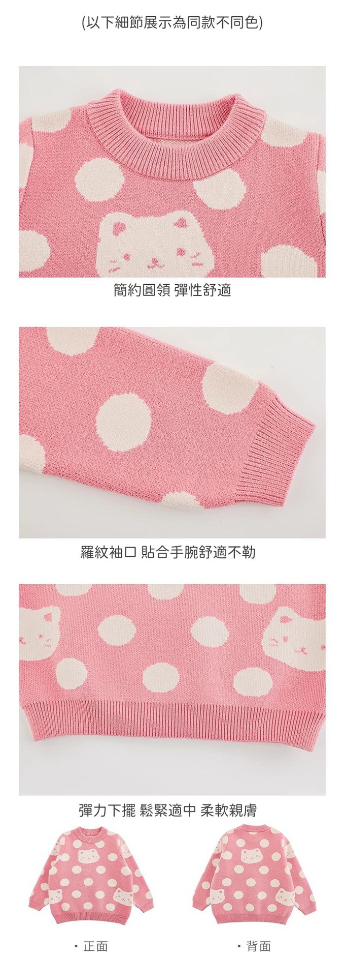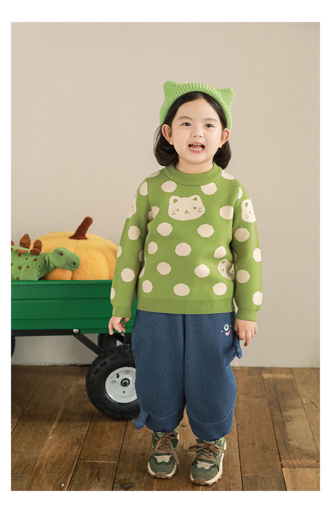 抗起球圓領長袖針織上衣/毛衣-點點貓咪-綠色