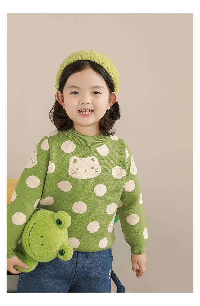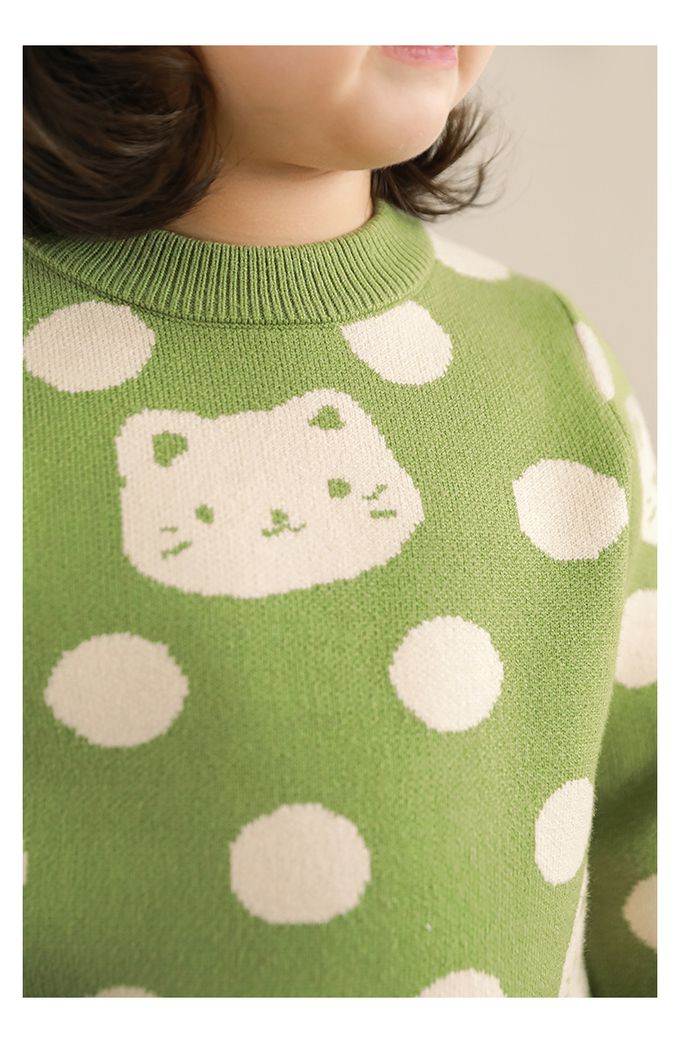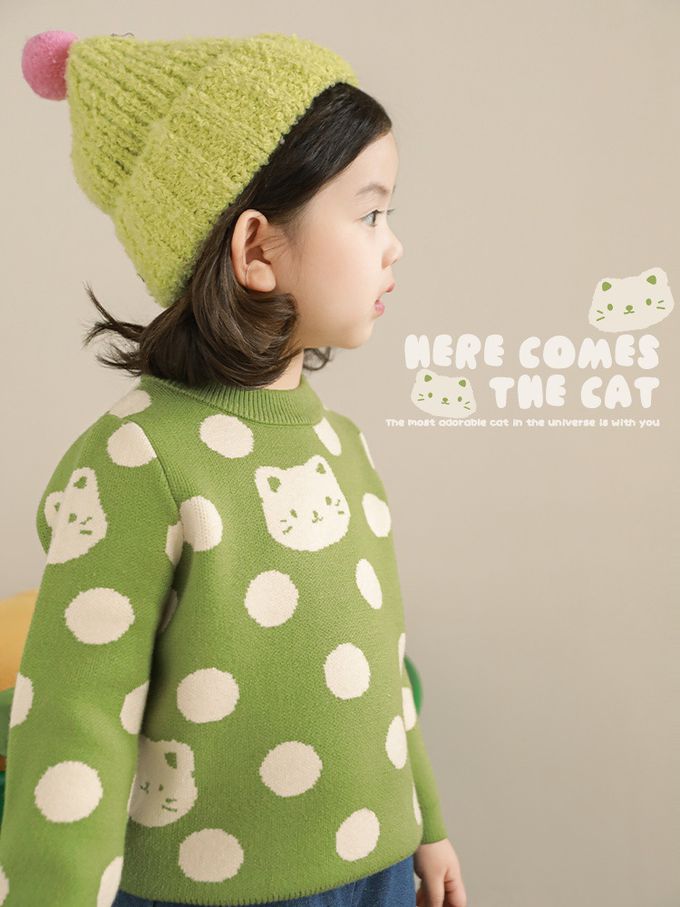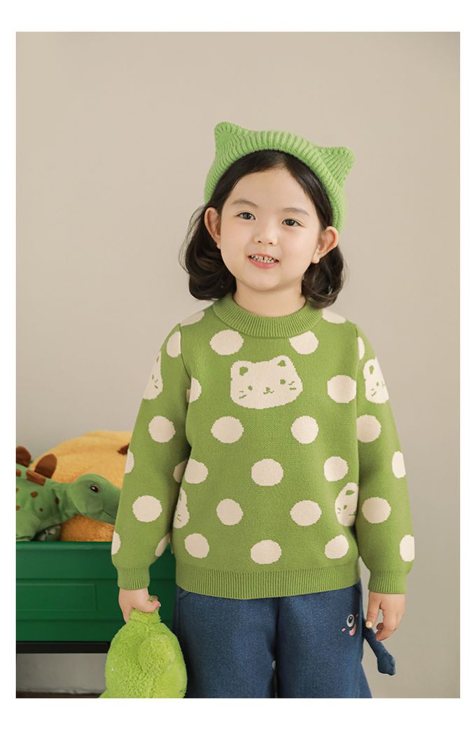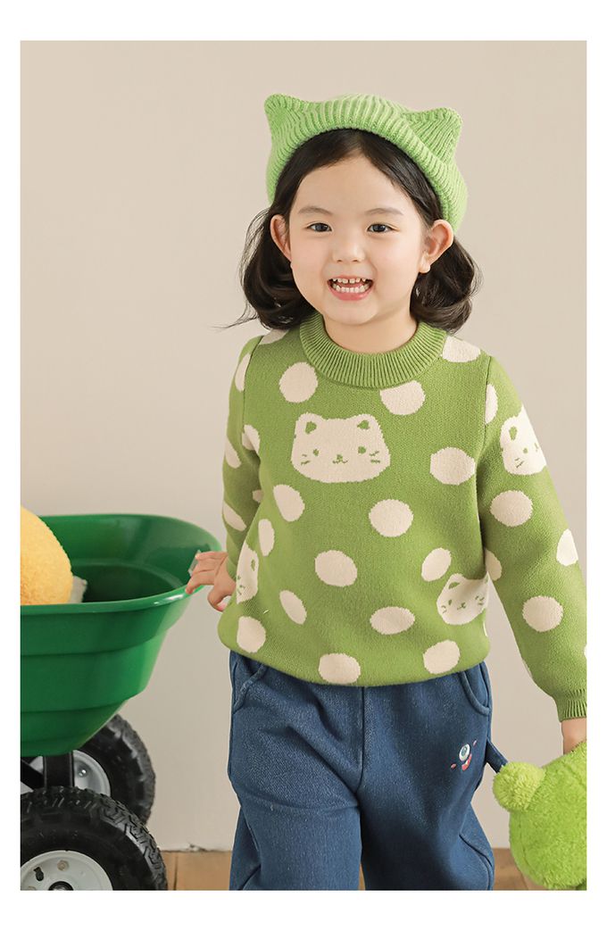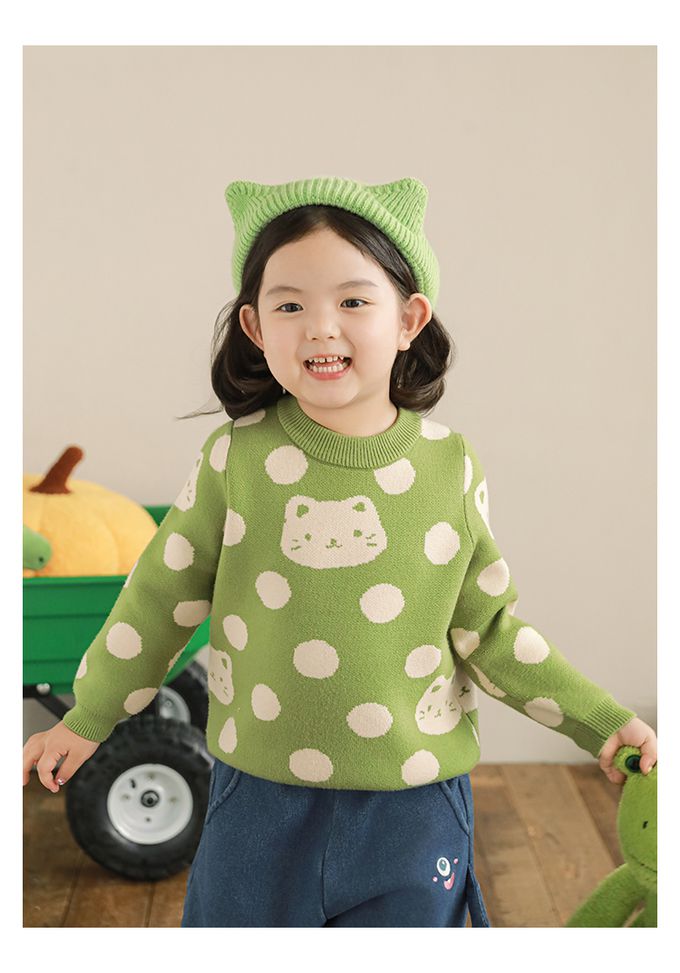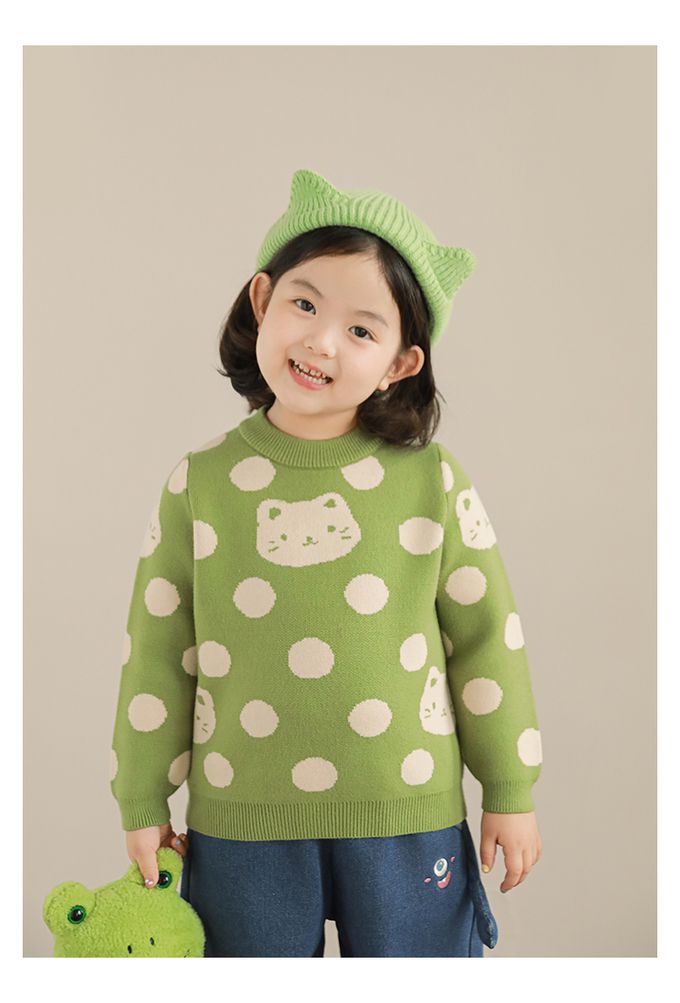 TONGMO - 抗起球圓領長袖針織上衣/毛衣-點點貓咪-綠色