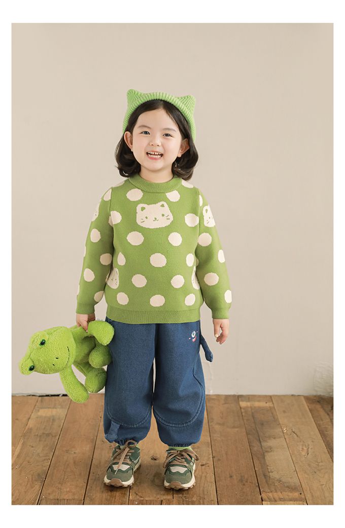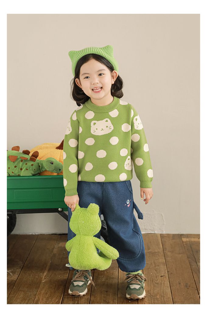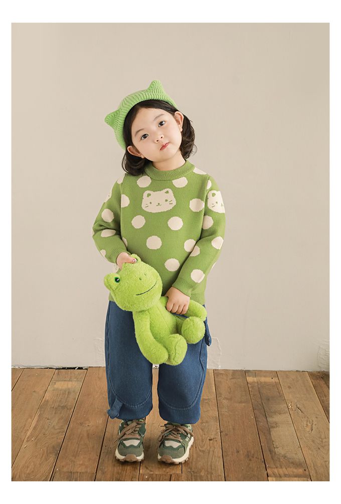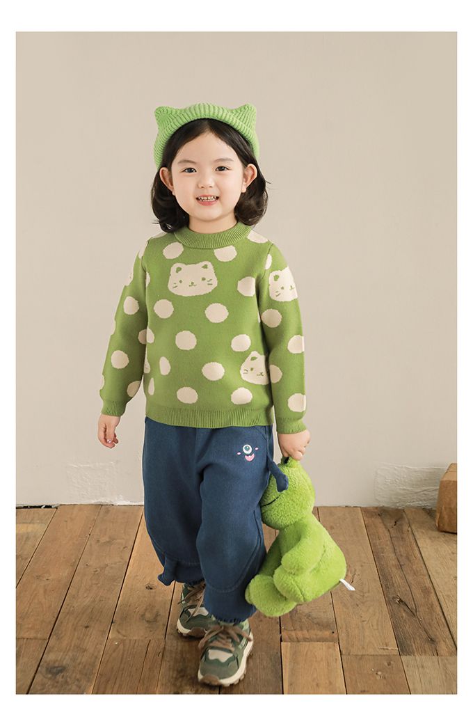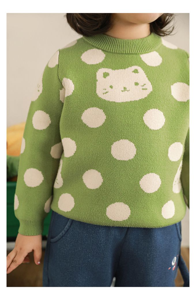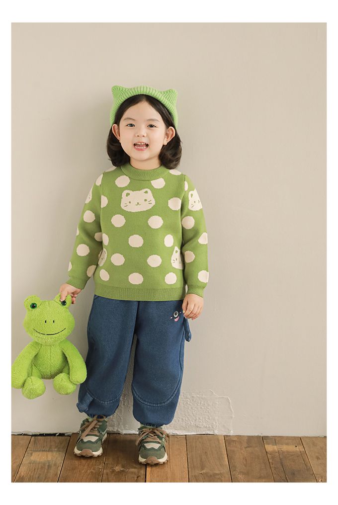 TONGMO - 抗起球圓領長袖針織上衣/毛衣-點點貓咪-綠色