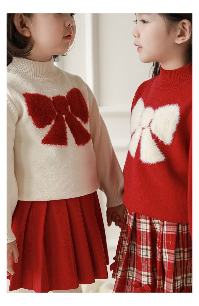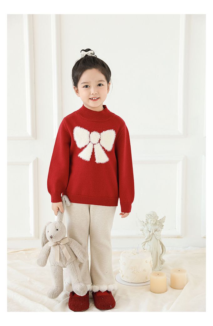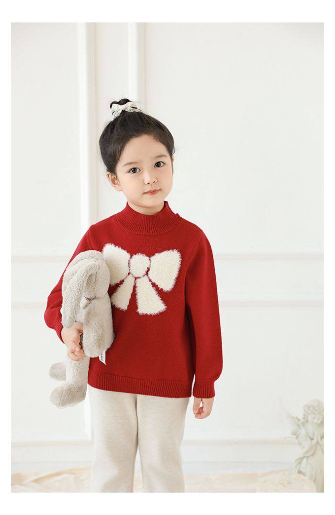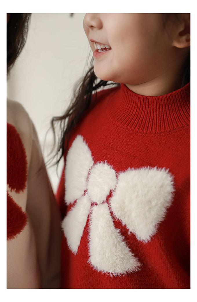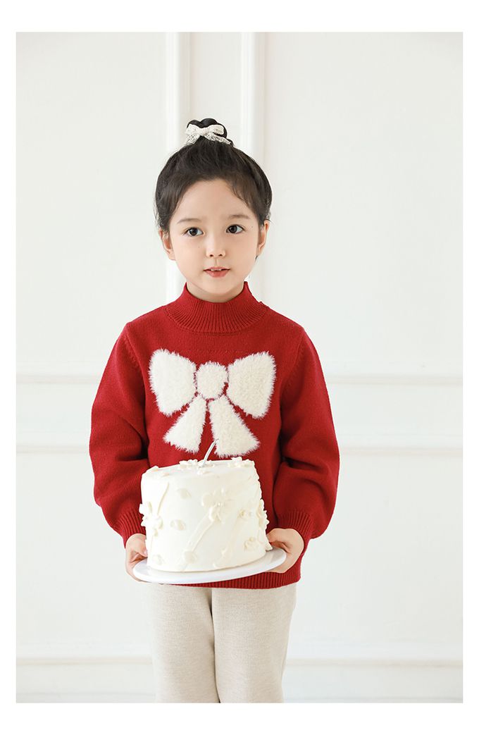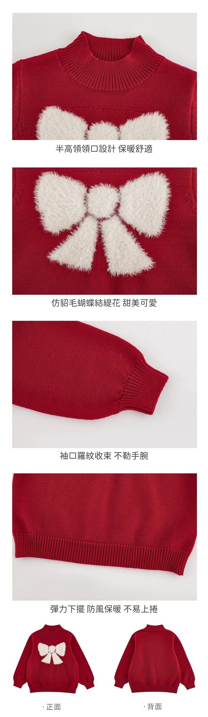 半高領長袖針織上衣/毛衣-貂毛感蝴蝶結-紅色