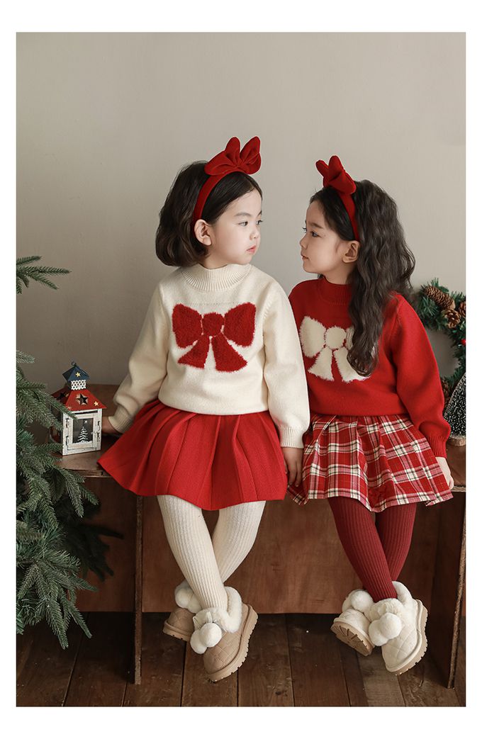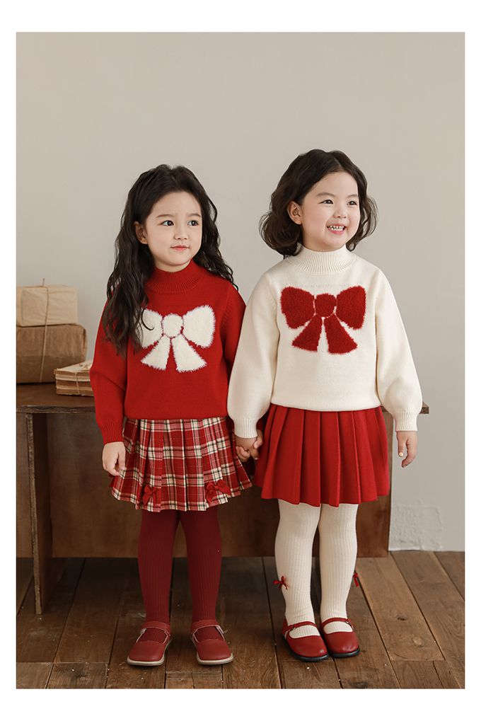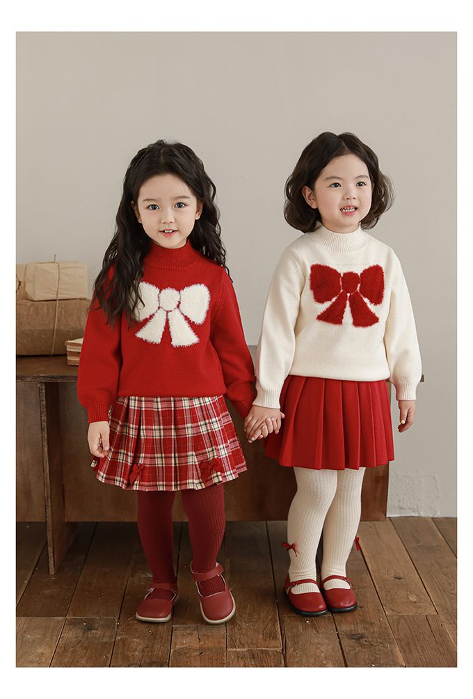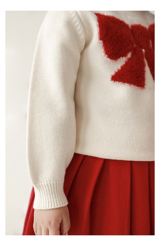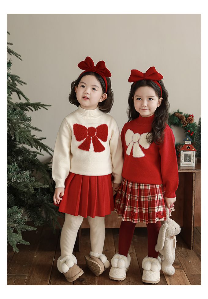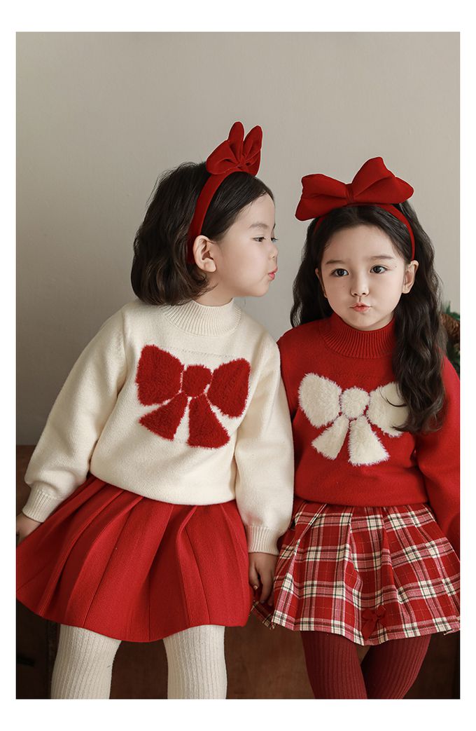 半高領長袖針織上衣/毛衣-貂毛感蝴蝶結-紅色