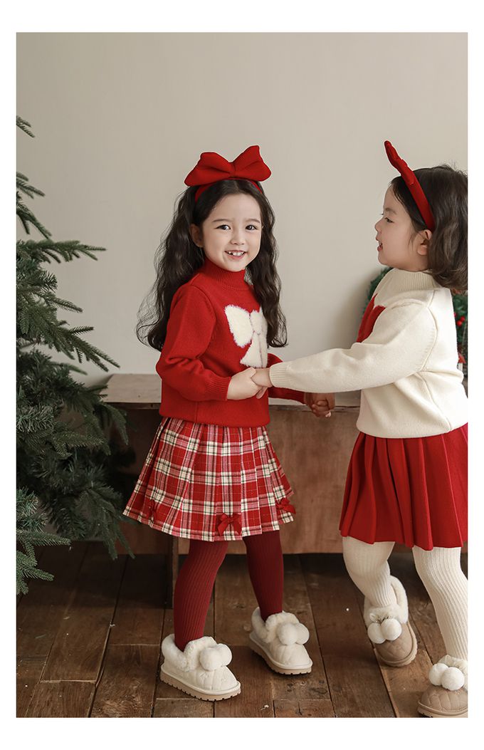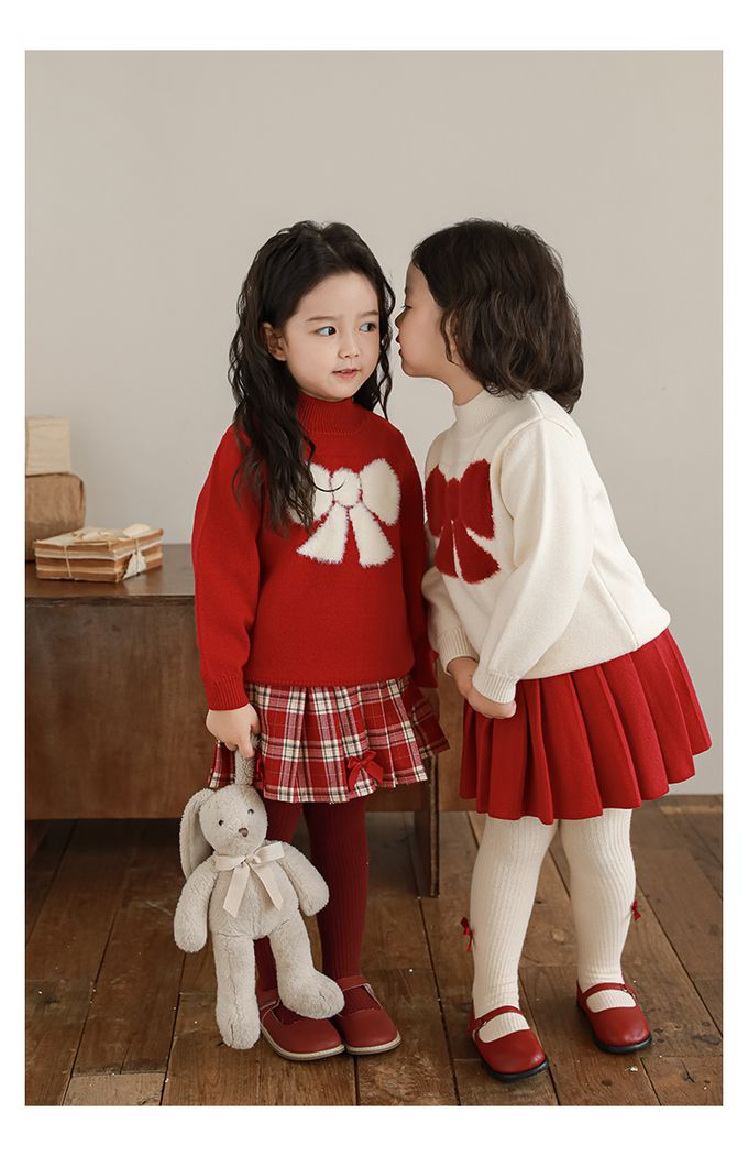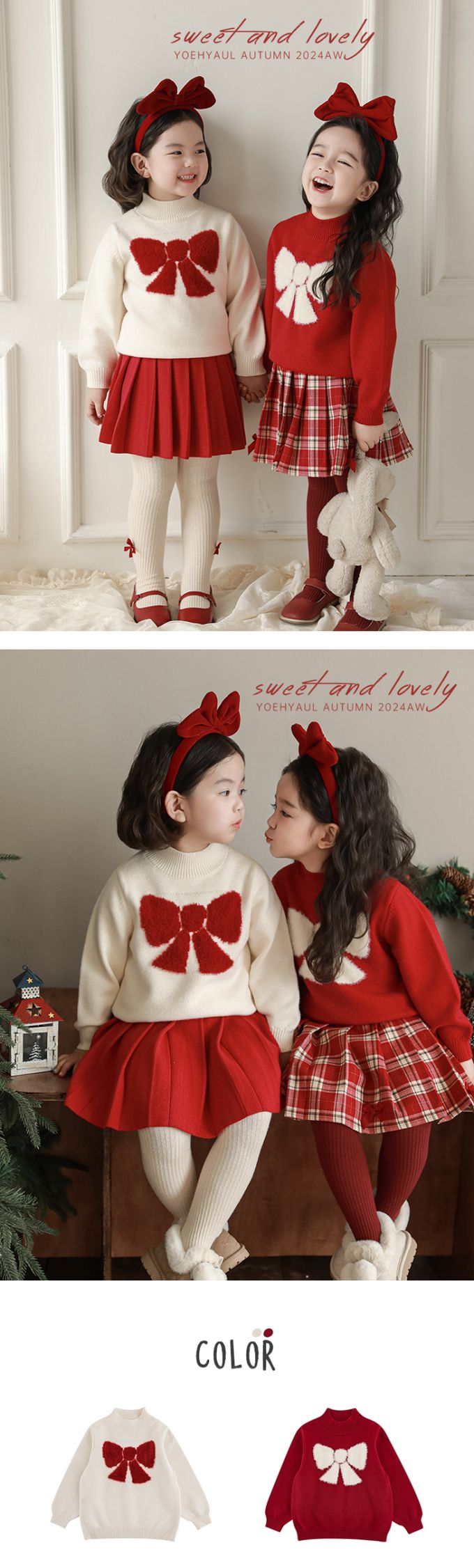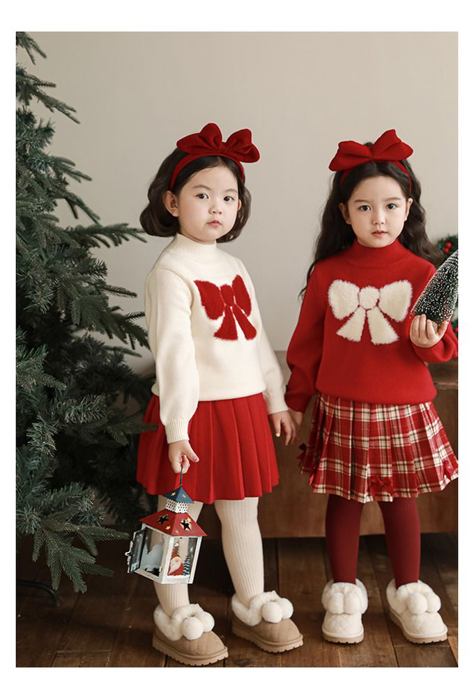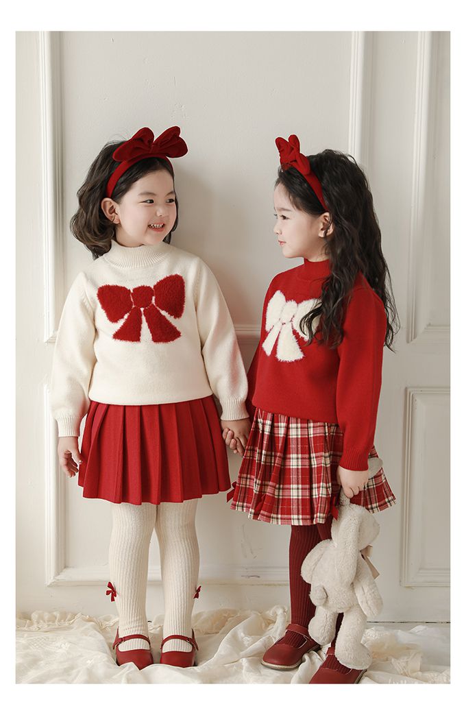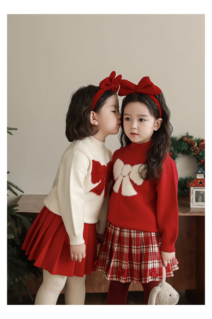 半高領長袖針織上衣/毛衣-貂毛感蝴蝶結-紅色