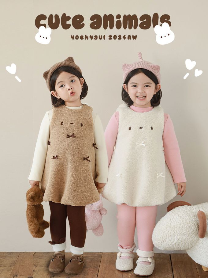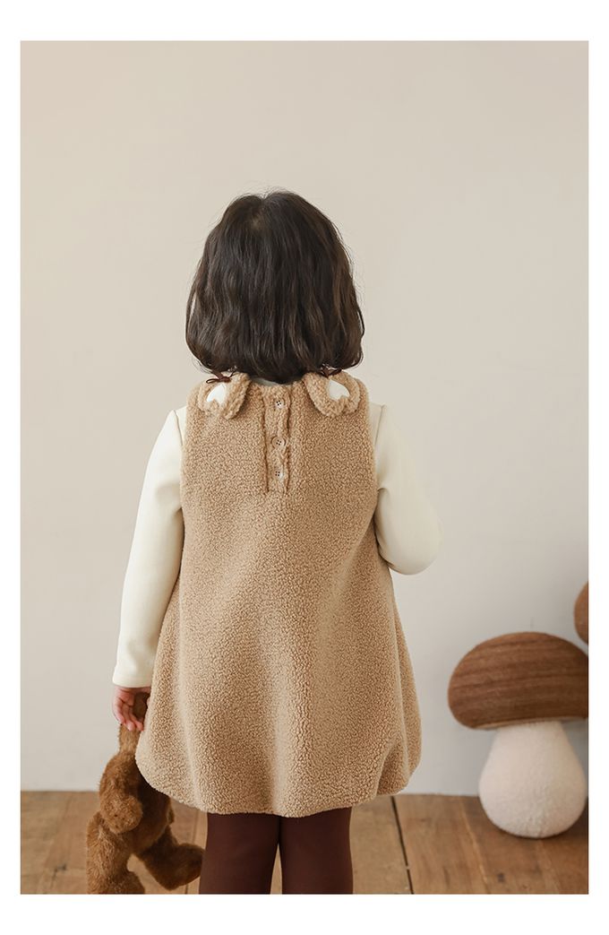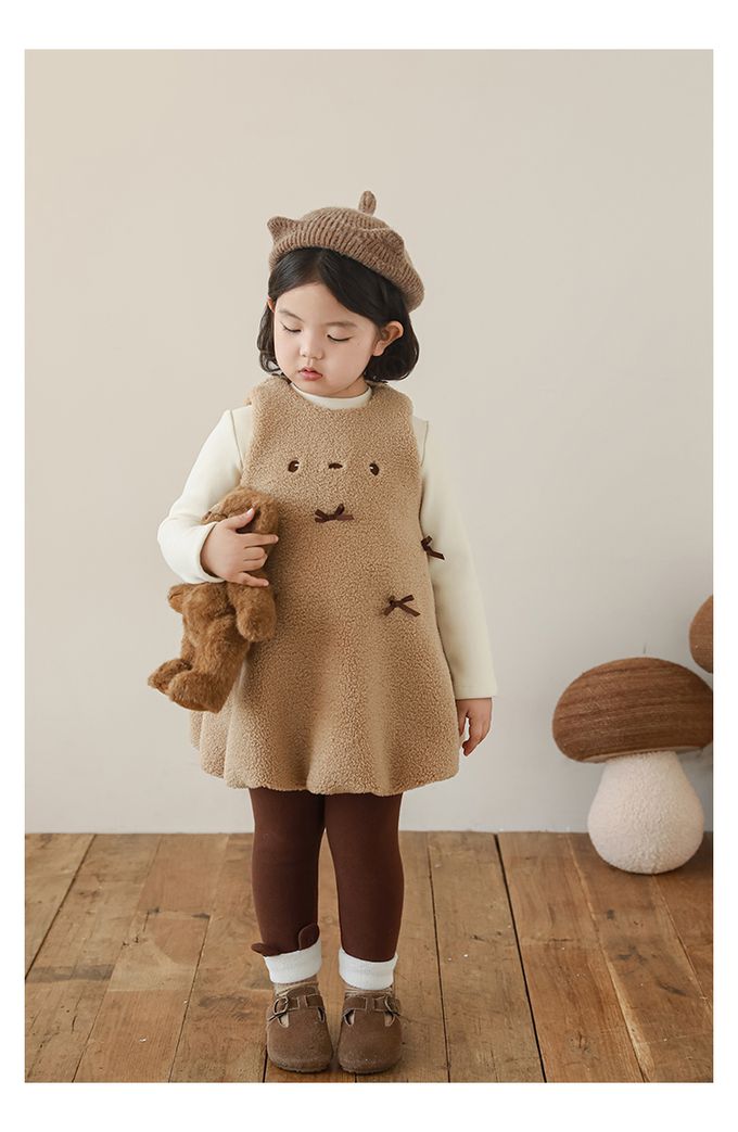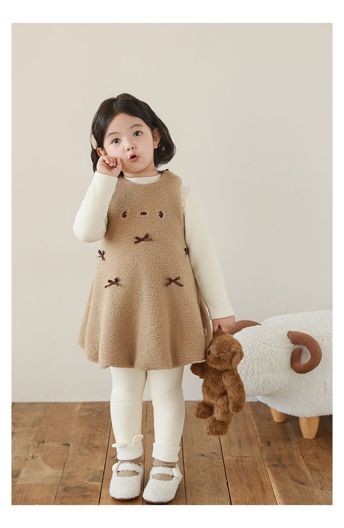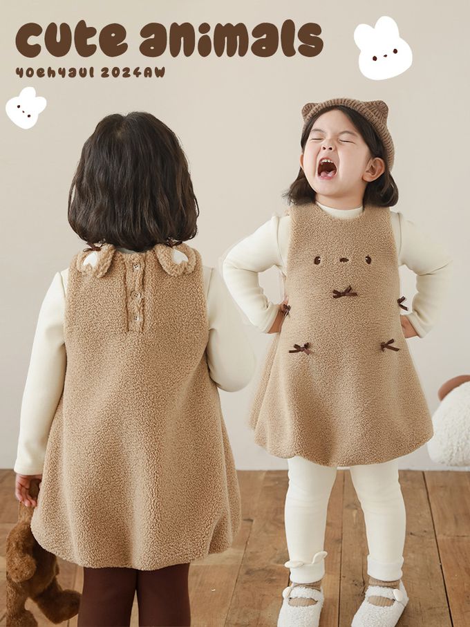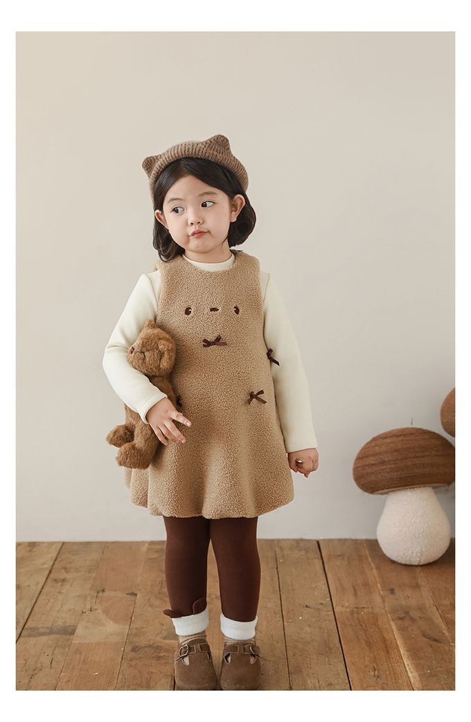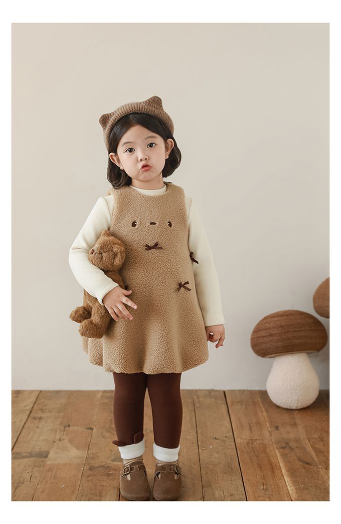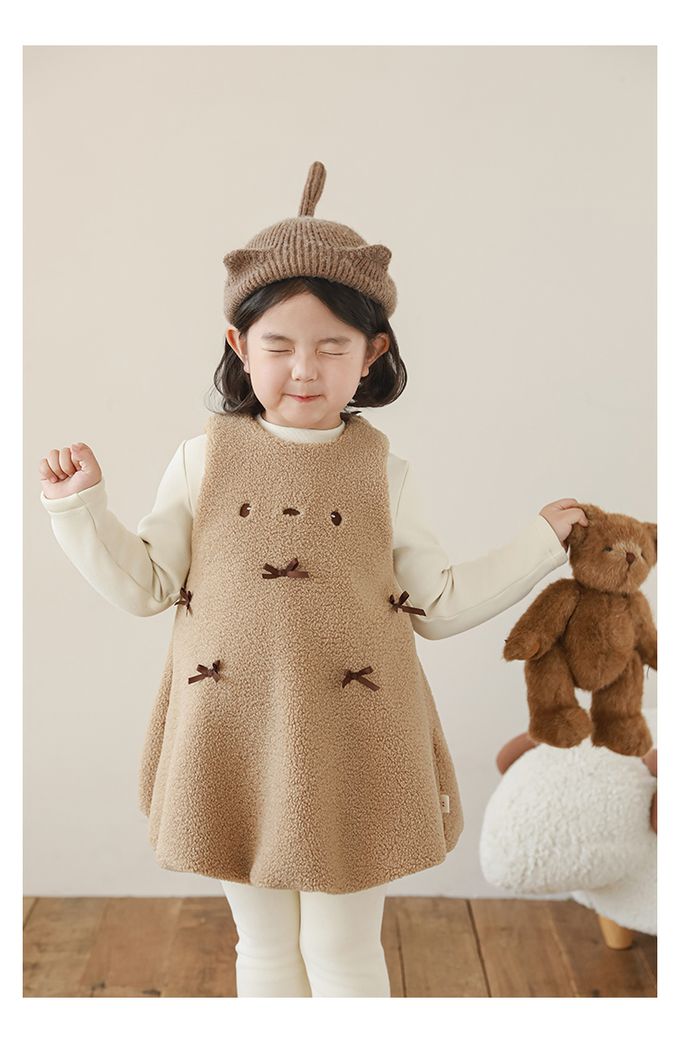 TONGMO - 泰迪熊毛毛花苞背心裙/洋裝(加絨)-刺繡表情-卡其色