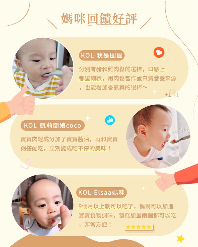 注意事項:1.適合10個月以上且能順利咀嚼的寶寶食用 2.生產線同時加工含有豆類之商品,不適合對其過敏者食用 3.本產品不含防腐劑,食用前請保持餐具乾燥並取用適量肉 鬆,以防受潮發霉