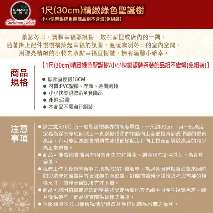 品名:台灣製1尺(30cm)精緻綠色聖誕樹/小小快樂銀牌系裝飾品組不含燈(免組裝)本島免運費/耶誕禮物