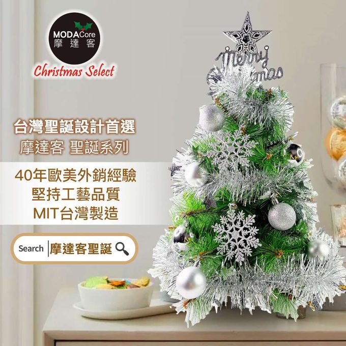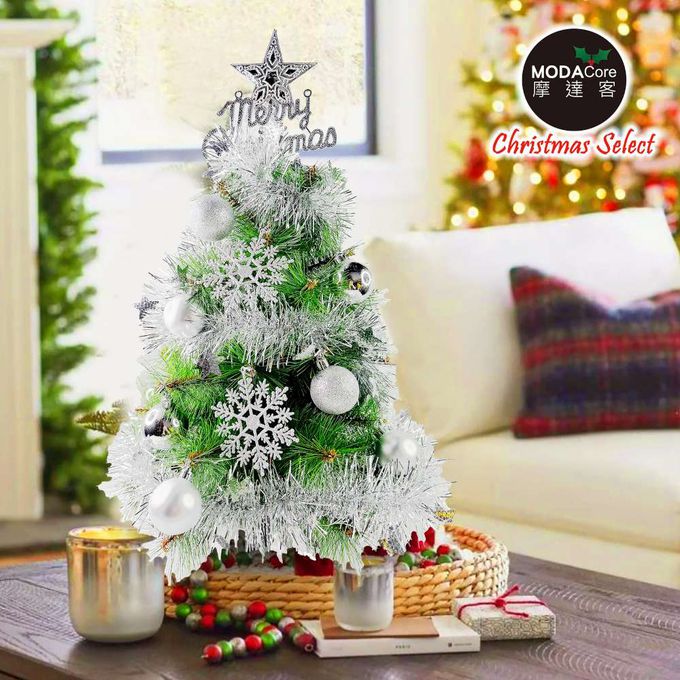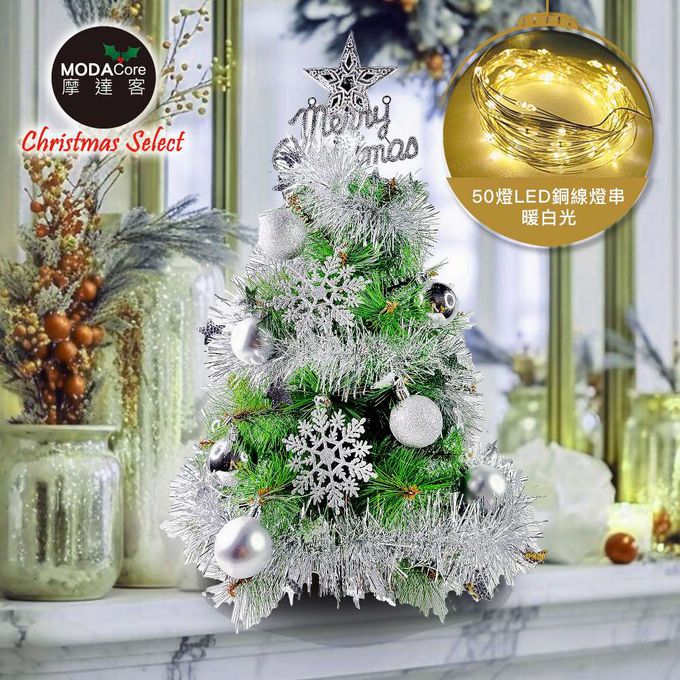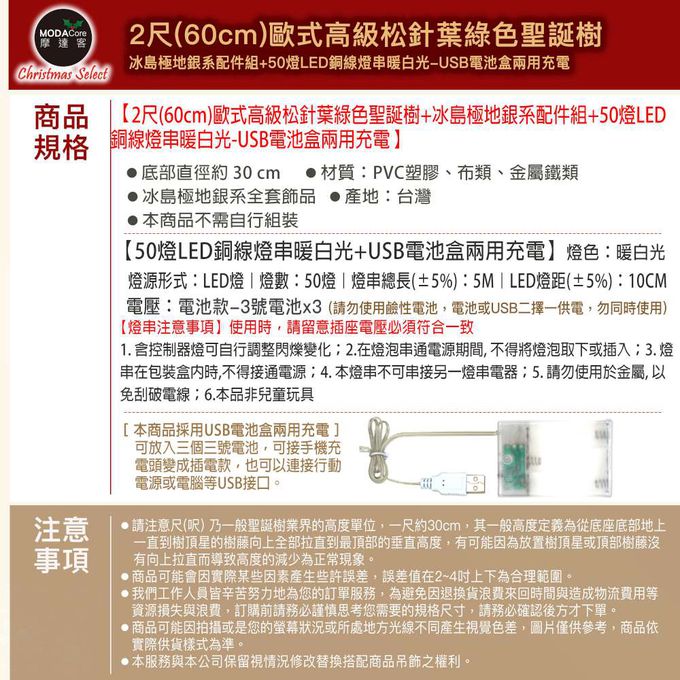 品名:台灣製2尺(60cm)歐式高級松針葉綠色聖誕樹+冰島極地銀系配件組+50燈LED銅線燈串暖白光-USB電池盒兩用充電/本島免運費