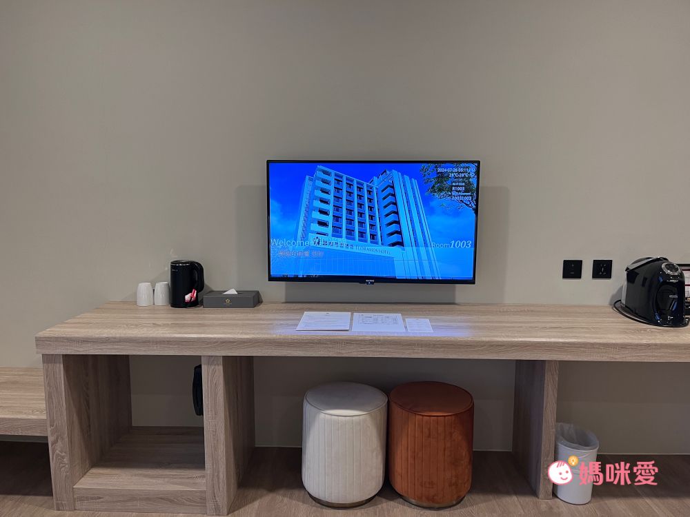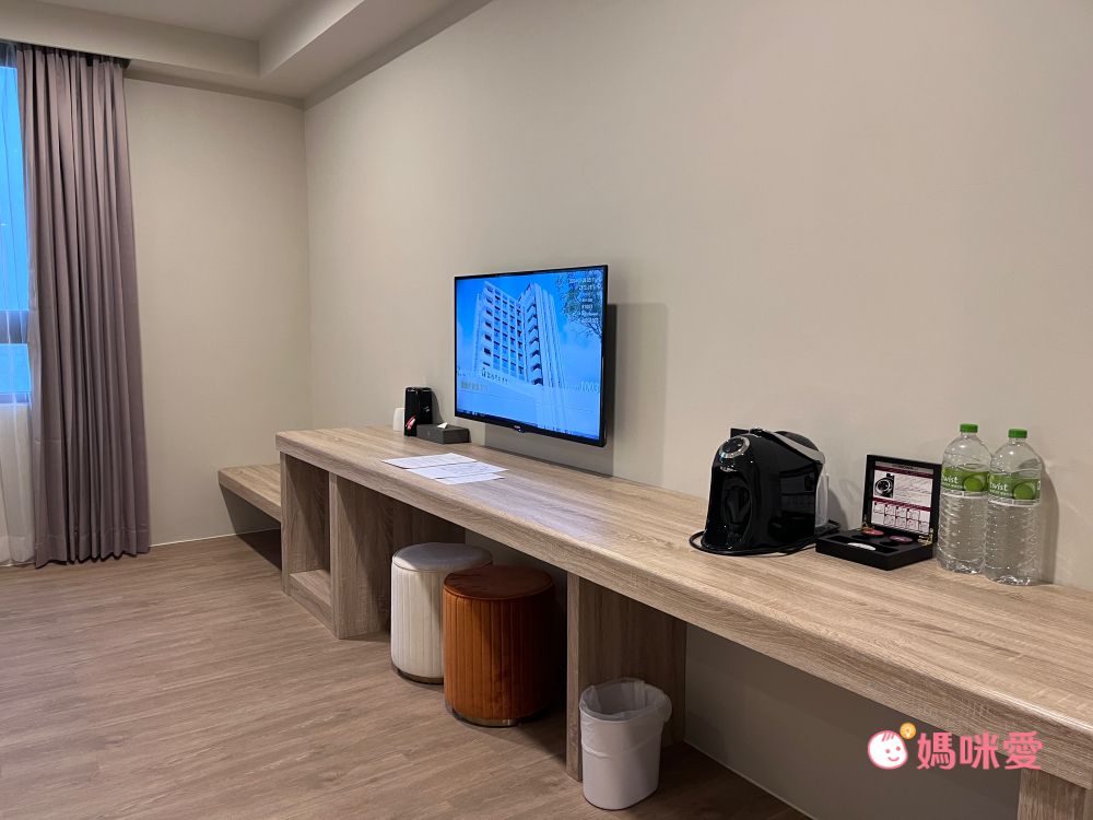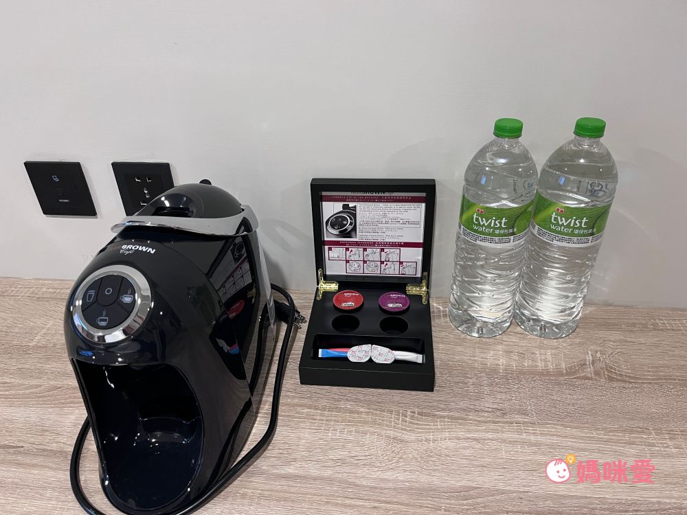 房間備有2瓶大水,跟一般只有2瓶小水不一樣,讓G編這種愛喝水的人就不怕喝完了。膠囊咖啡機跟熱水壺,讓有需要的客人都可以使用。