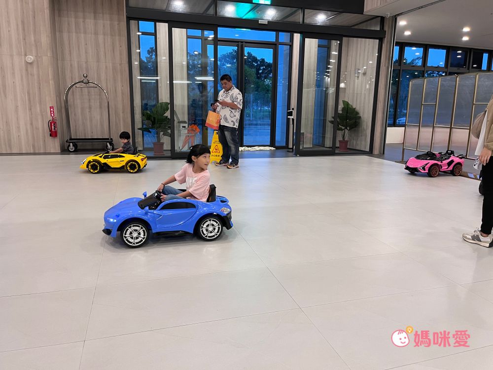 因為我們去的當天剛好颱風過後有下雨,所以原本在戶外的小賽車就改到了大廳隔壁的位置!還特別有隔開一區給小朋友們玩哦!之後就會改回去戶外的賽車場玩囉。(限3歲以上25公斤以下乘坐,開放時間 9:00~21:00 ,但會看天候狀況調整開放與否(天候不佳、下雨不開放,請依現場為主))