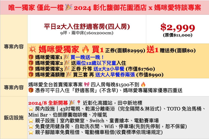 (贈品數量有限,務必於原專案期限內入住者才可享有。除加碼贈送不含早住宿券乙張之外,其餘專案內容皆以原票券為主(加價規則等)。媽咪愛與馥御花園酒店保有解釋之權利。)