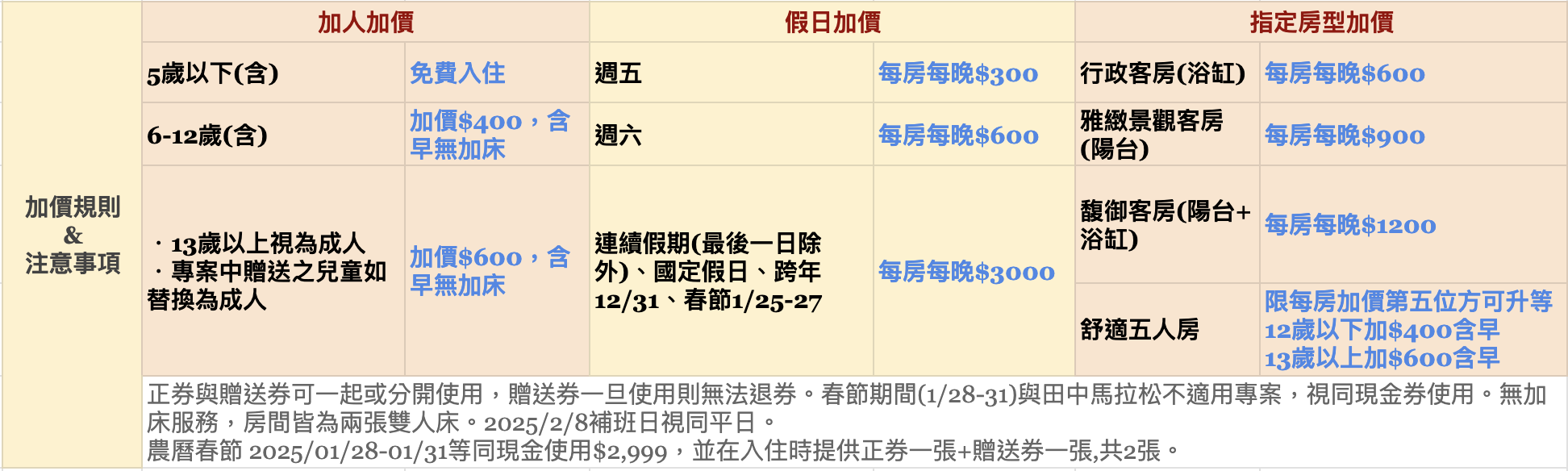 註:平日定義:週日-週四;旺日定義:週五/補班日,加價$300;假日定義:週六加價$600;連續假期(最後一日除外)、國定假日、跨年12/31、春節前夕2025/1/25-27,加價$3000。(春節期間1/28-31與田中馬拉松不適用專案,視同現金券使用。)(本專案為特殊專案,平假日定義與官網略有不同,加價規則以專案內容為主)