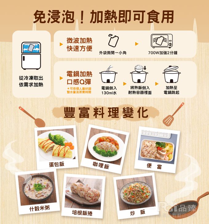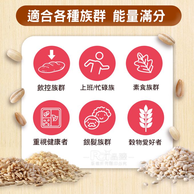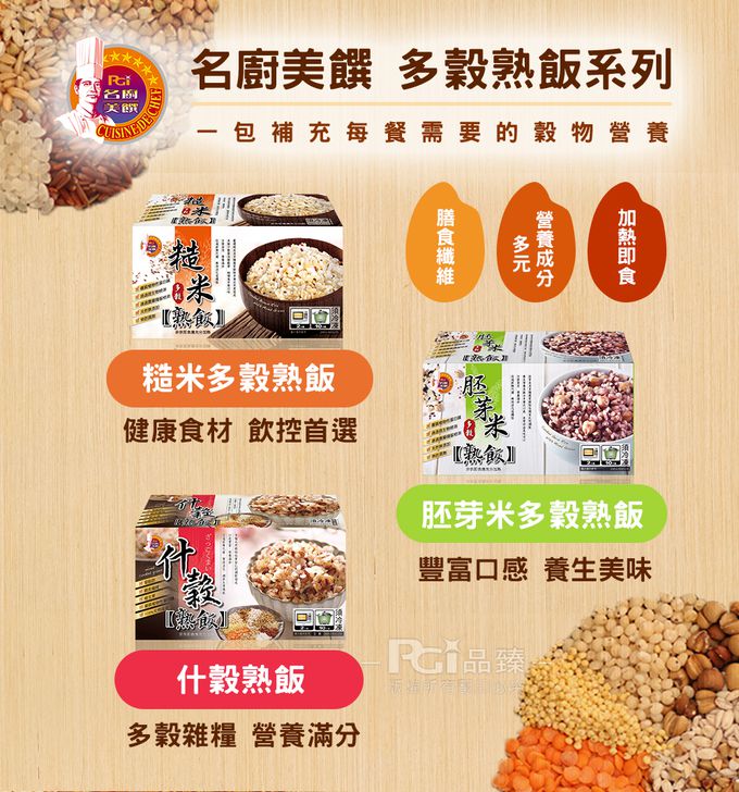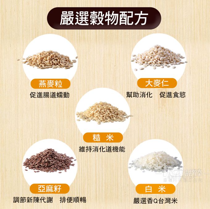 成分:糙米-水、糙米、白米、大麥仁、燕麥粒、亞麻籽 胚芽米-水、胚芽米、白米、黑糯米、鷹嘴豆、紅藜麥 十穀-水、白米、燕麥、紅米、大麥仁、蕎麥仁、糙米、紅薏仁、高梁米、小米、紅扁豆