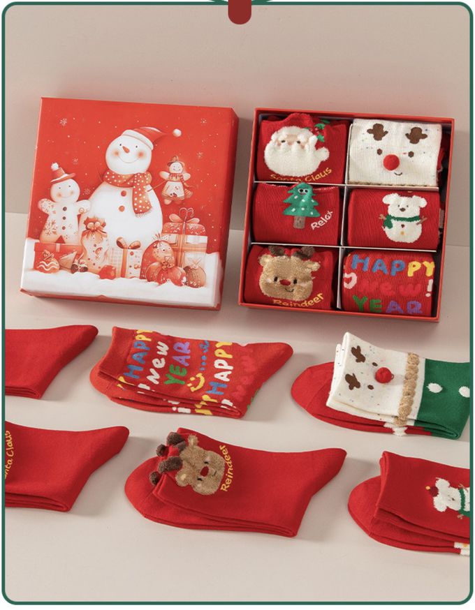聖誕主題麋鹿雪人中筒棉襪 (均碼 (腳長20cm~25cm))-6 雙一組禮盒裝