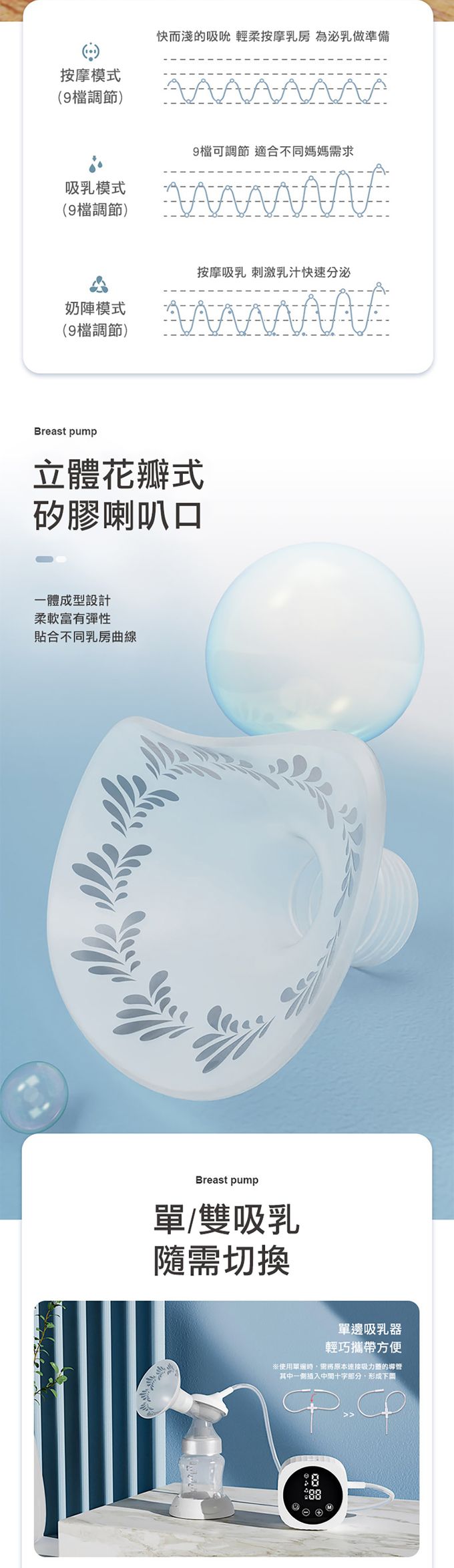 3.三種模式 按摩/吸奶/奶陣,每種模式都有9種不同檔位可調,照自己的需求做調整。