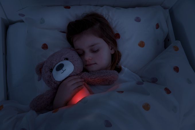 在夜晚的就寢時間,睏寶好朋友的肚子會發出舒緩的紅光,並在10分鐘後自動關閉,燈光亮度可依個人喜好調整。