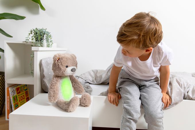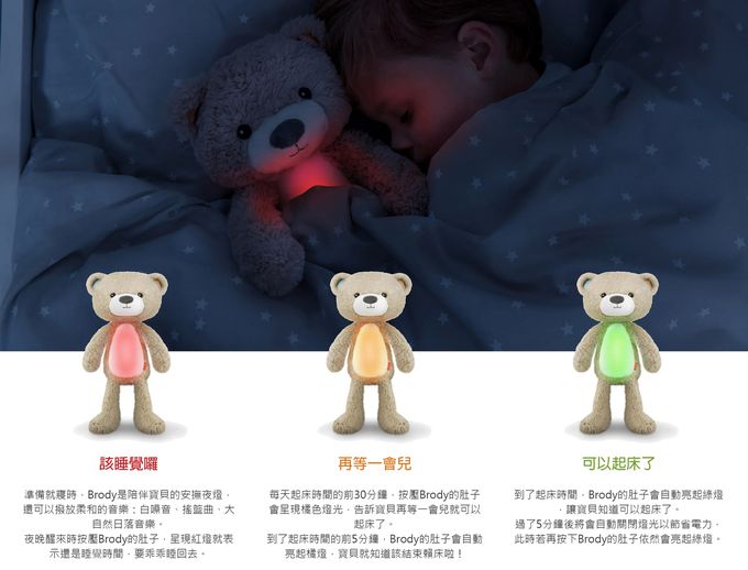 睏寶好朋友Brody用舒緩的夜燈和音樂幫助您的孩子在晚上入睡。清晨透過肚子的燈光顏色告訴寶貝什麼時候該睡覺、什麼時候可以起床。紅、黃、綠的燈光就像交通指示一樣,小寶貝可以輕易理解,為爸爸媽媽爭取再多睡一會兒的時間。