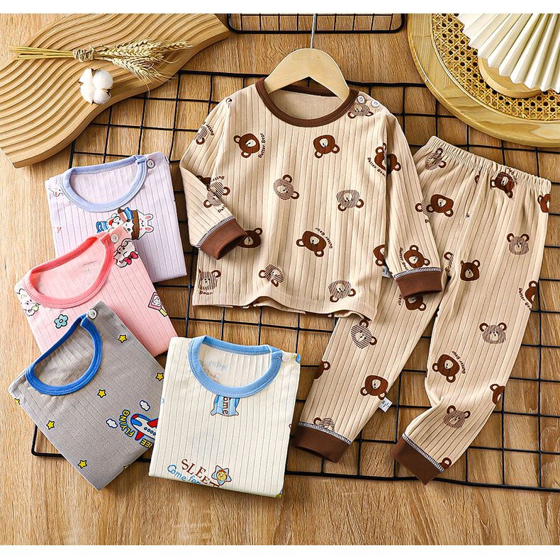 WarmNest - 純棉長袖家居服套裝-貪睡熊熊-米/藍