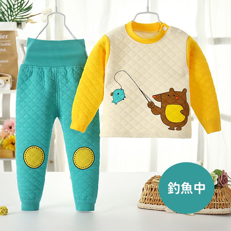 純棉高腰護肚鋪棉長袖家居服套裝-釣魚中-黃/藍綠