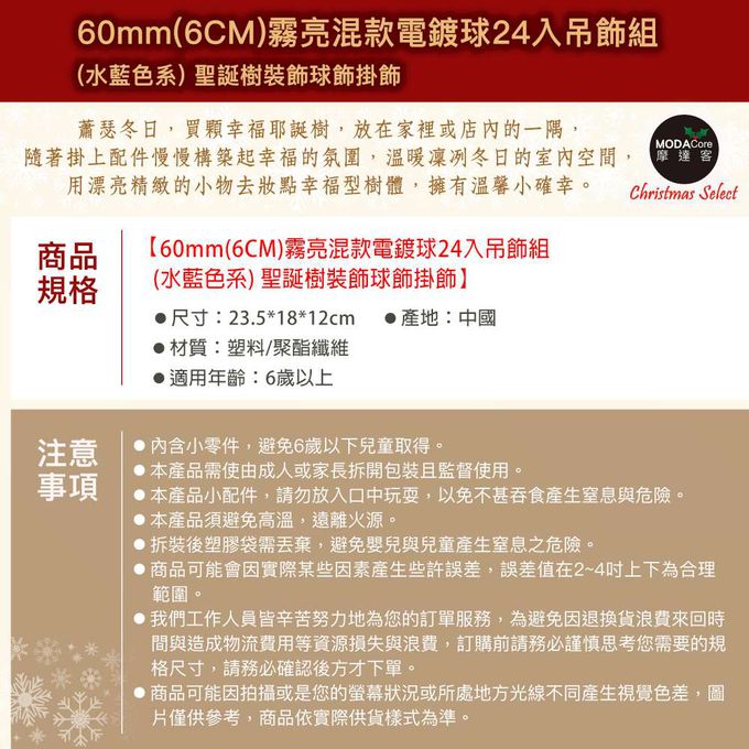 品名:耶誕-60mm(6CM)霧亮混款電鍍球24入吊飾組(水藍色系) 聖誕樹裝飾球飾掛飾