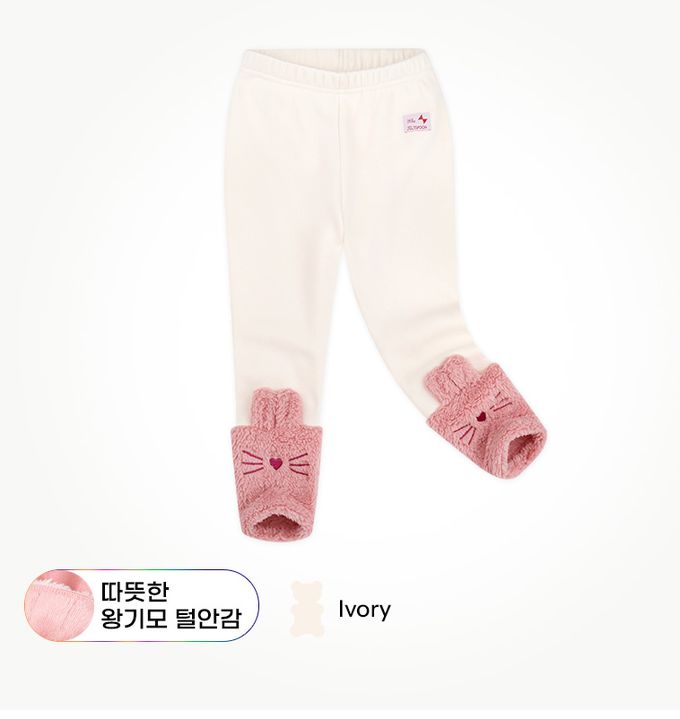 韓國 Jelispoon - 鬆緊腰毛絨刺繡兔裝飾刷毛內搭褲-粉兔-象牙白