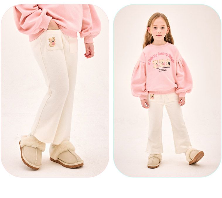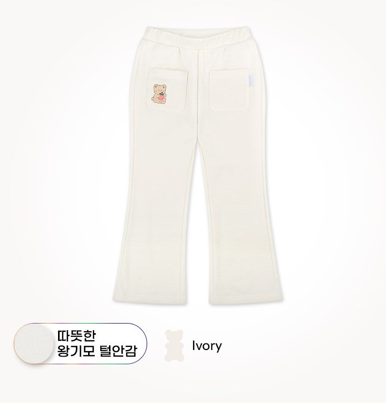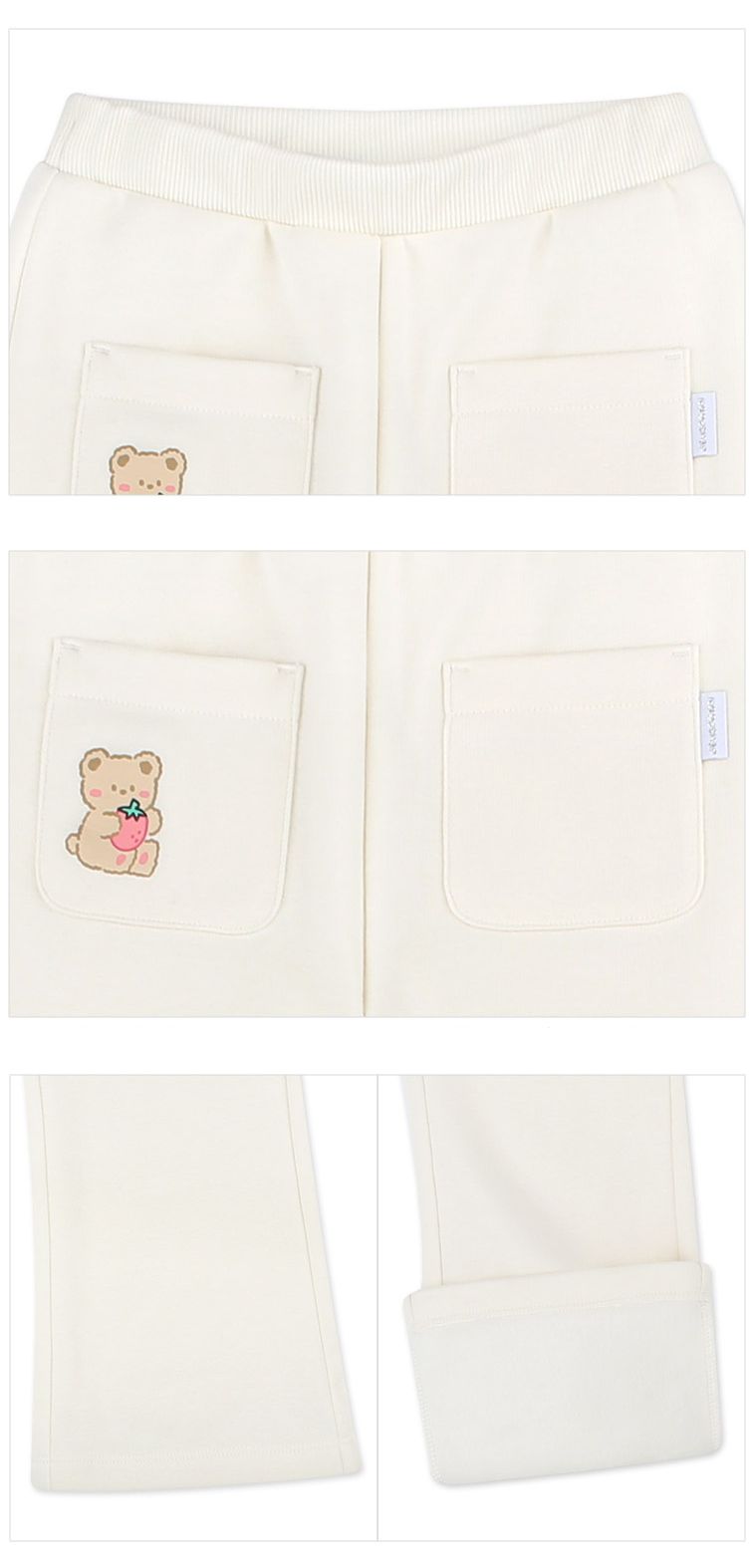 韓國 Jelispoon - 鬆緊腰雙口袋刷毛喇叭褲-草莓熊-象牙白