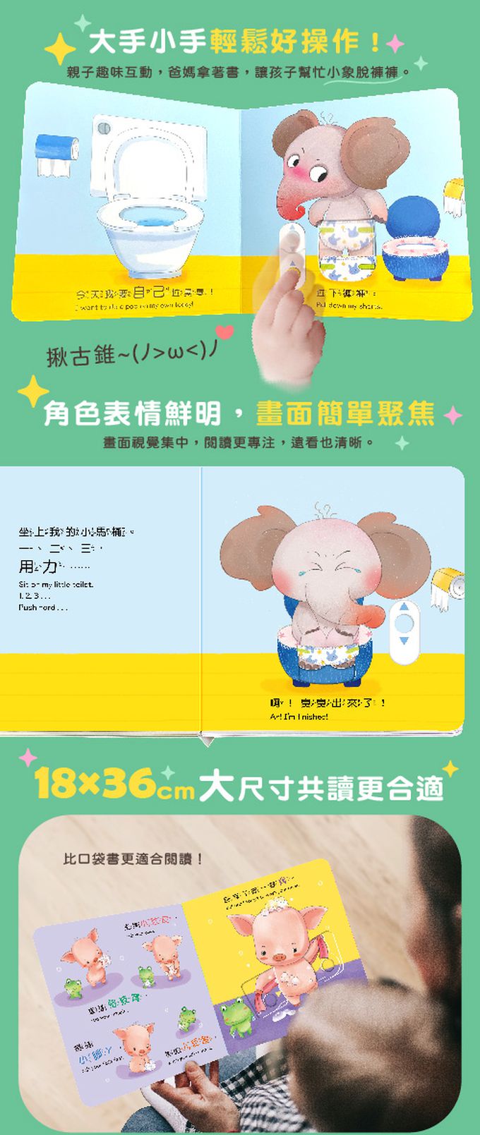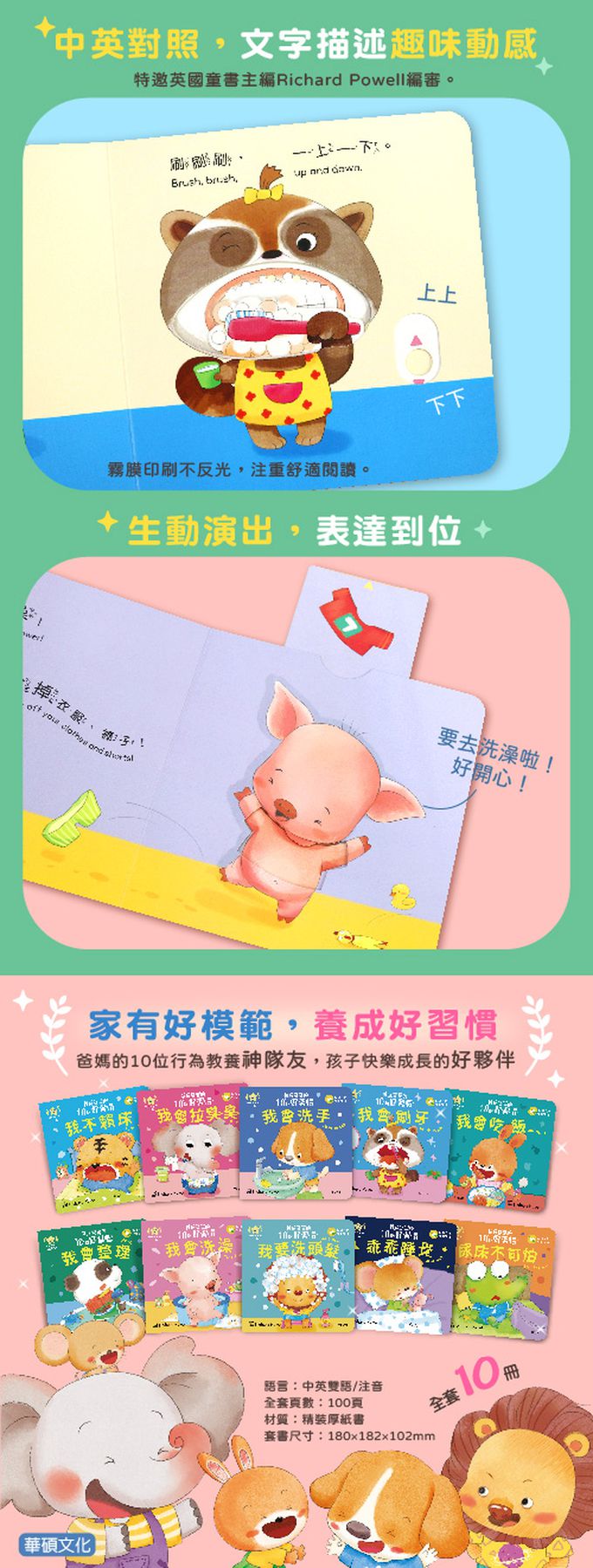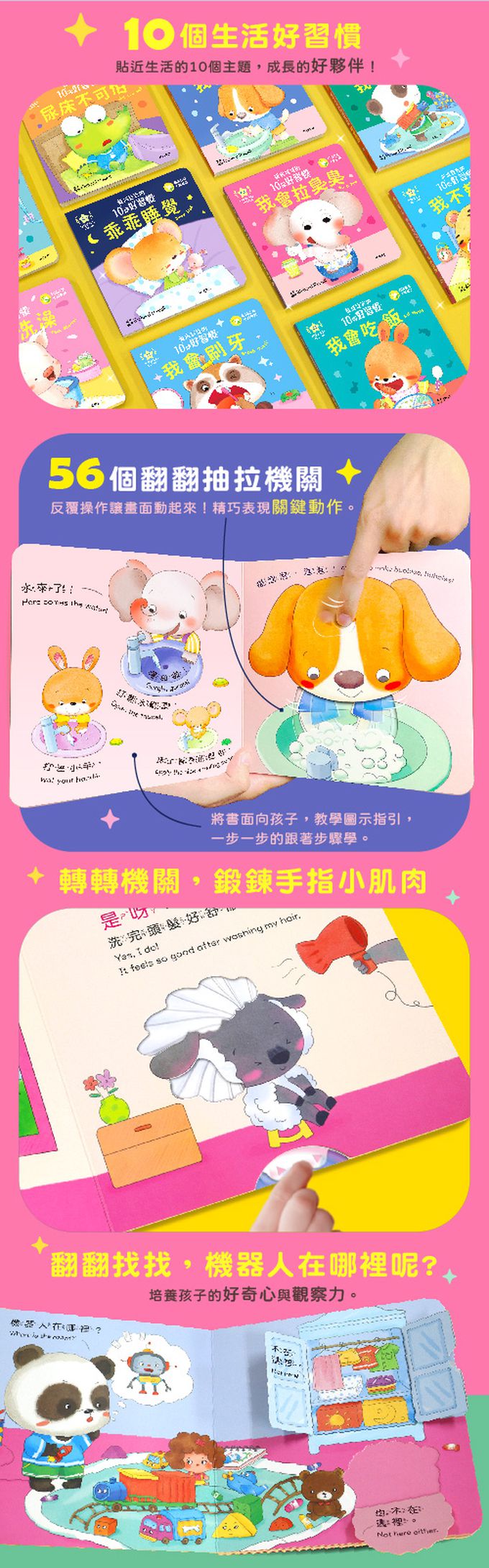 養成寶寶的10個好習慣包含:不賴床、自己上廁所、洗手、刷牙、吃飯、整理收拾、洗澡、洗頭髮、睡覺、尿床,這些主題與孩子的日常生活息息相關,書中的每一頁都有操作機關,增加互動性,記憶更深刻。