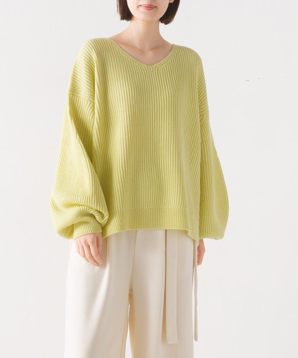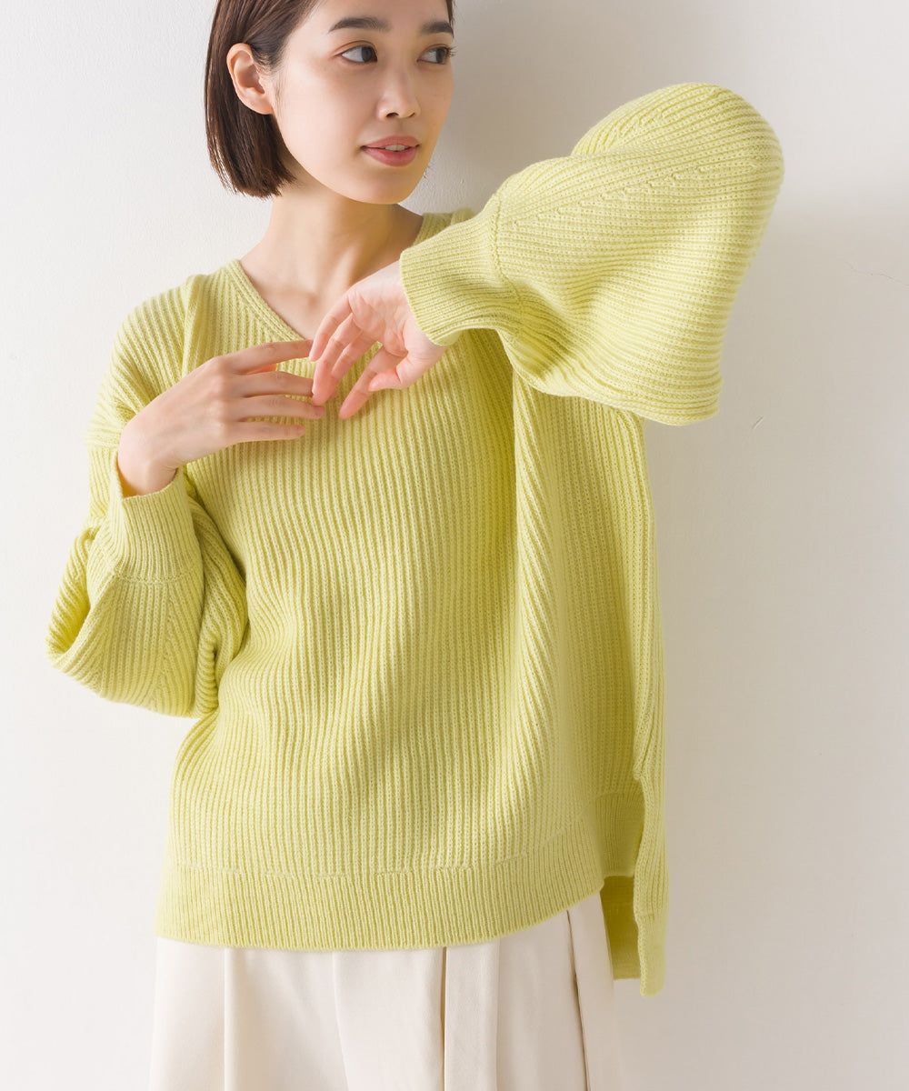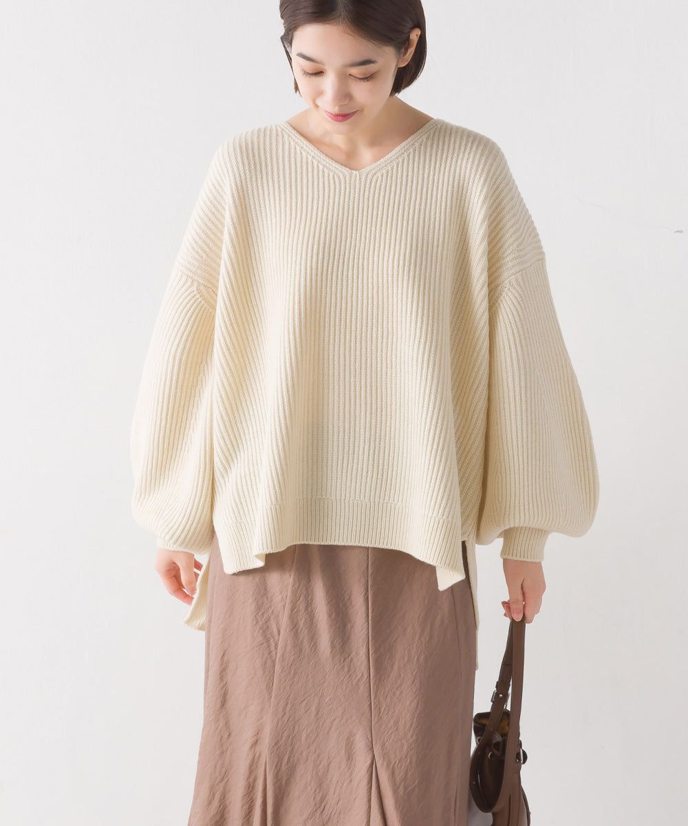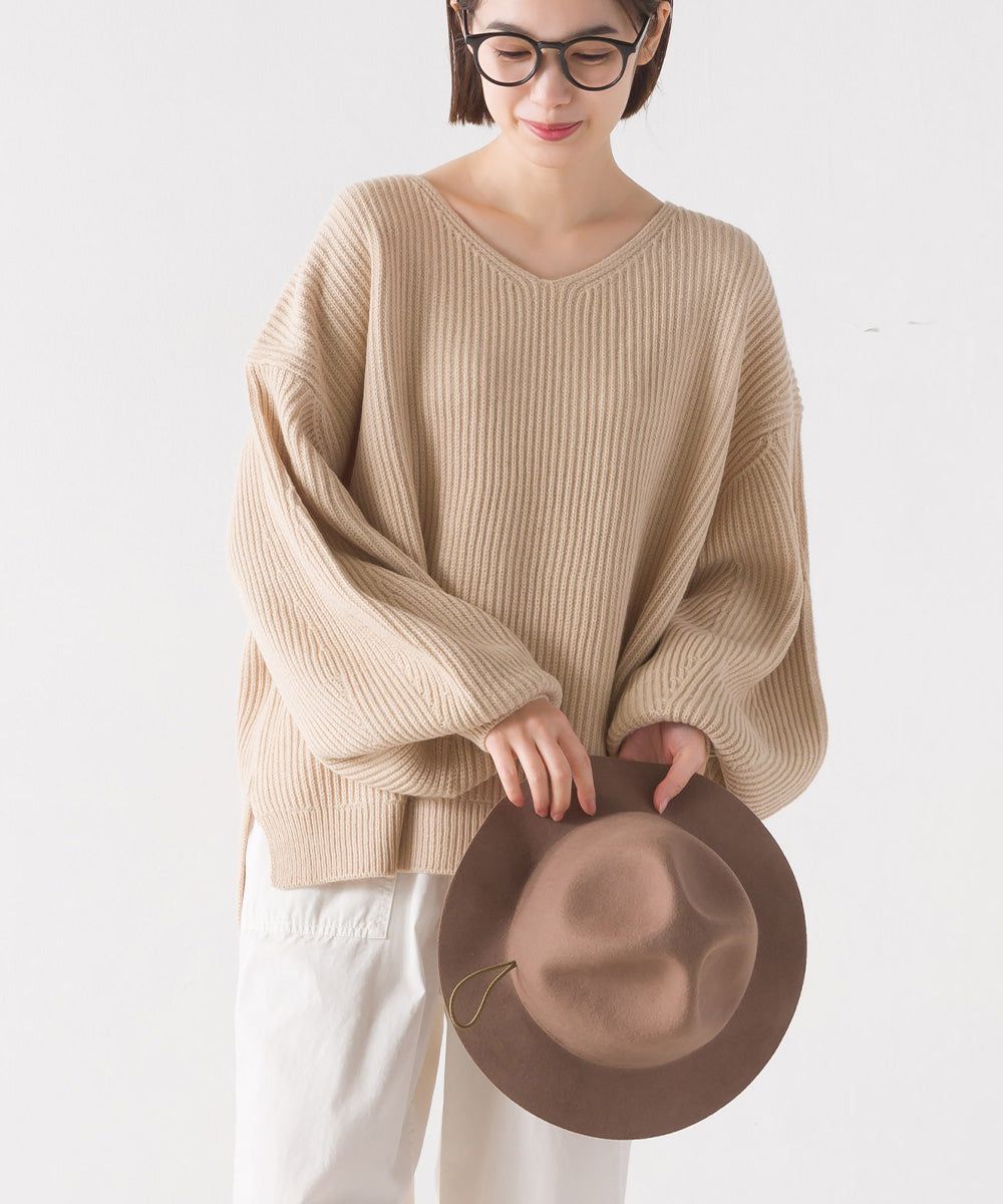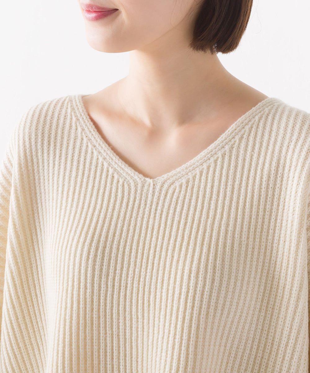 混羊毛V領羅紋寬袖針織上衣
