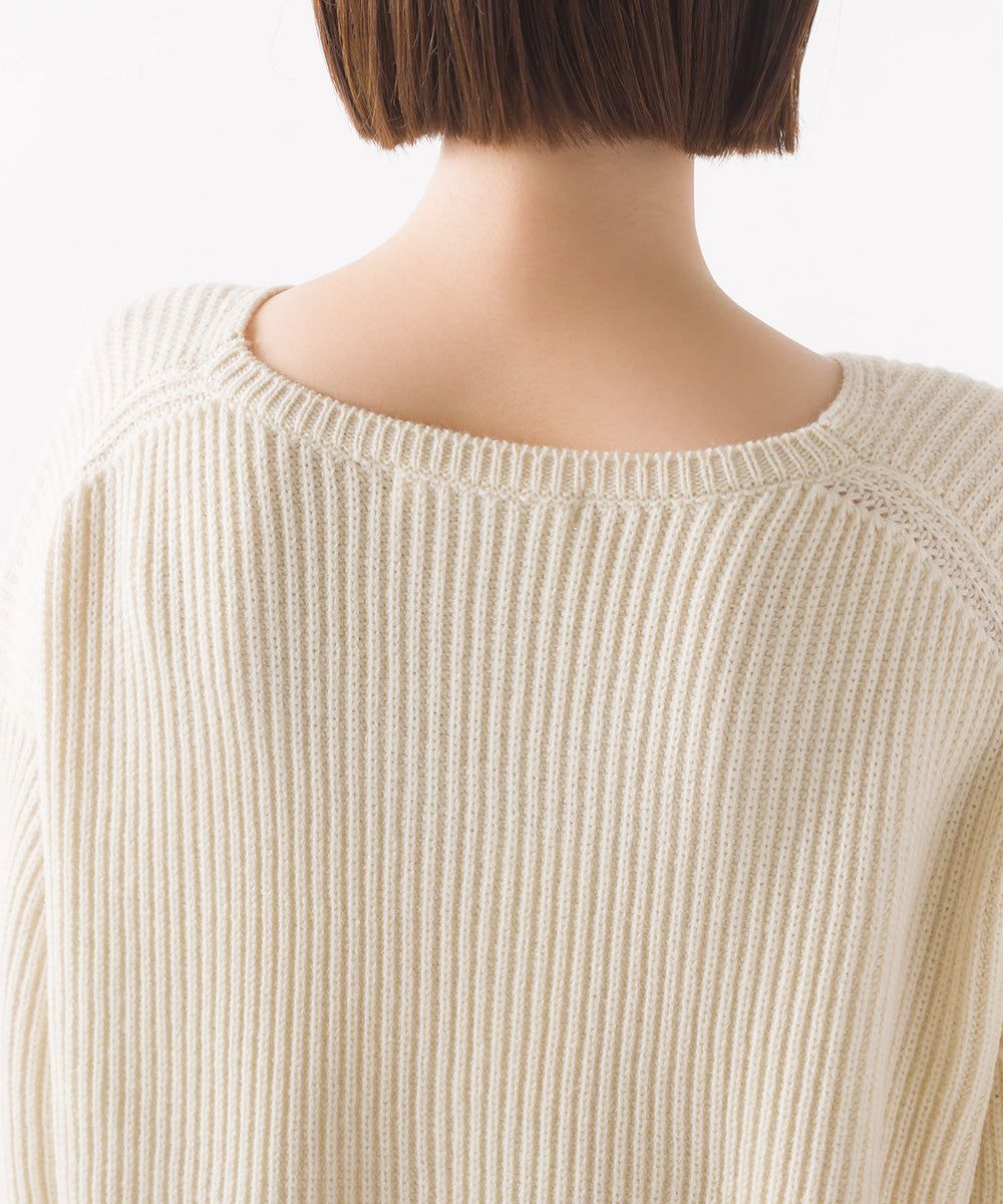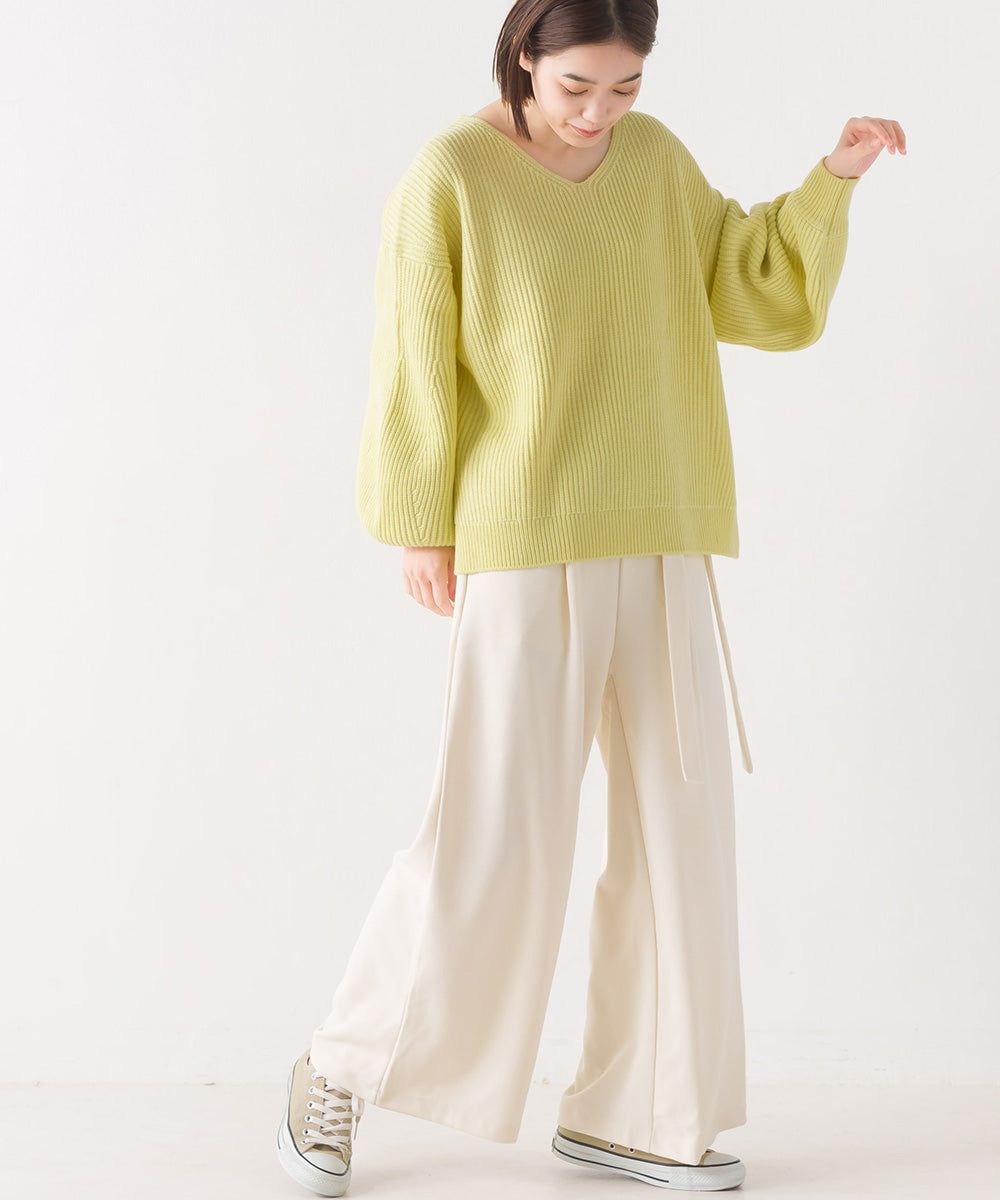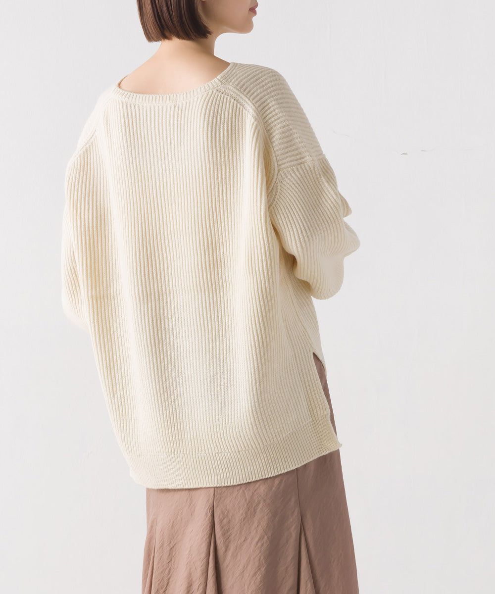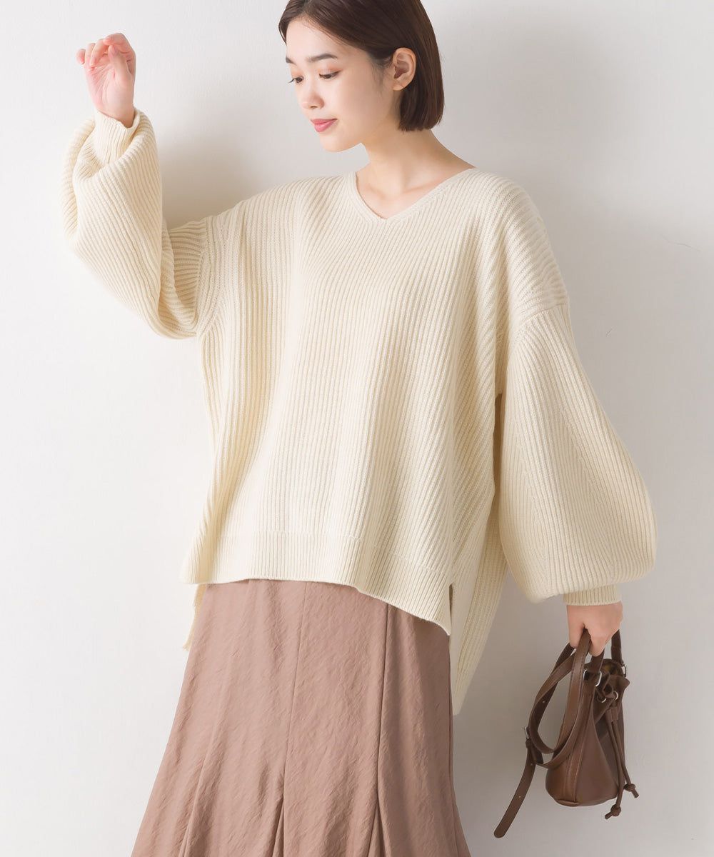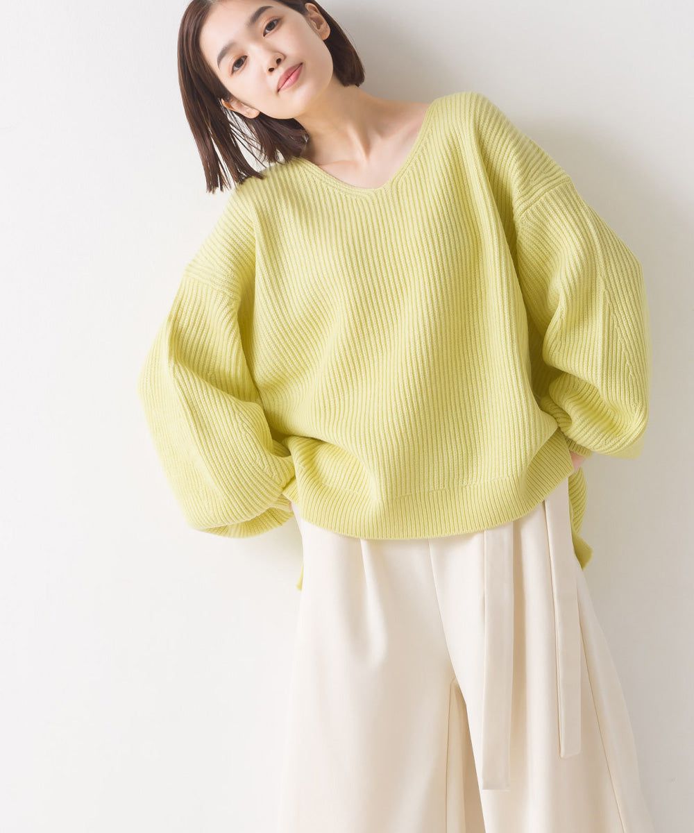 混羊毛V領羅紋寬袖針織上衣