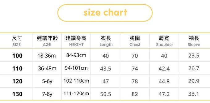 1. 尺寸表單位皆為公分(cm),實際尺寸會因布料彈性、水洗、測量起迄點等因素略有誤差。建議參考孩子平時穿著衣物尺寸進行選購。
