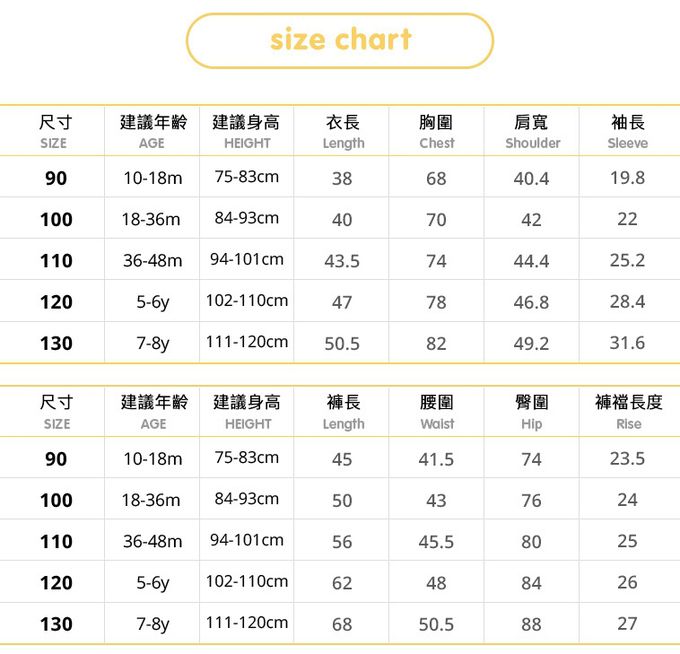 1. 尺寸表單位皆為公分(cm),實際尺寸會因布料彈性、水洗、測量起迄點等因素略有誤差。建議參考孩子平時穿著衣物尺寸進行選購。2. 建議以30度以下冷水,單獨手洗,以免造成移染或掉色。3. 如需機洗,請務必將衣服翻面放入洗衣網、再放洗衣機,以免刮損圖樣。(若有標註不可機洗或乾洗,請勿機洗、乾洗)4. 若含牛仔布、有色布料容易互相染色,請分開或單獨洗滌,以免相互移染。請使用中性洗劑。浸泡時間不宜過長。5. 請勿使用漂白劑、螢光增白劑及衣物柔軟劑,以免破壞布料或導致掉色。6. 洗滌後立刻晾乾,切勿使用烘衣機。過分烘乾可能會破壞織物纖維、導致衣物收縮。7. 如有熨燙需求,請低溫熨燙。8. 每件商品於拍攝時均力求忠實呈現,但因每台電腦、手機或平板等設備之螢幕亮度、解析度不同,可能會有些許色差,謝謝媽咪爸比們的體諒。9. 提醒您,七天猶豫期並非七天試用期呦!商品需保持全新、完整包裝始可申請退換貨,造成不便敬請見諒。10. 預購為海外同步代購,如遇缺貨會儘速通知、協助取消訂單/退款等事宜。