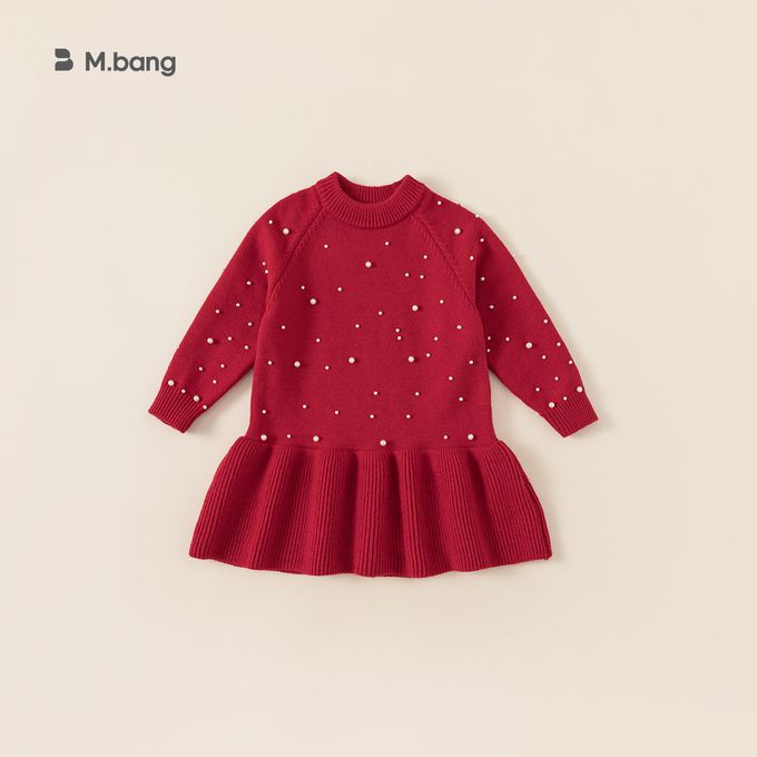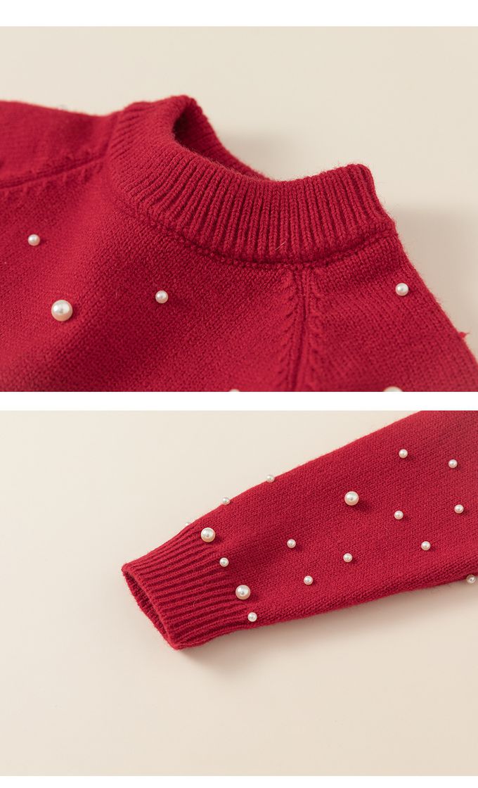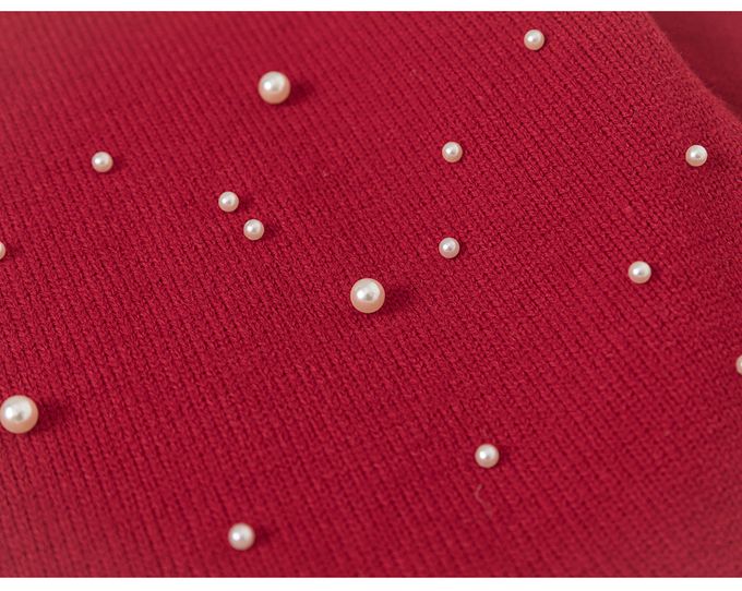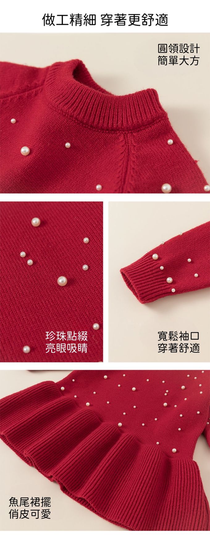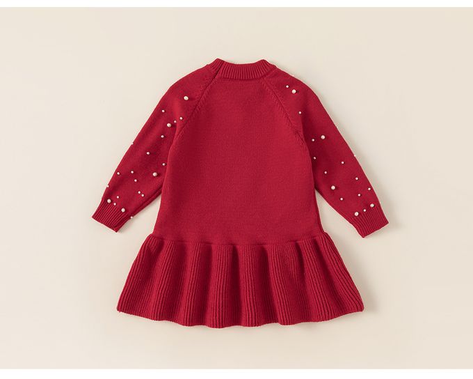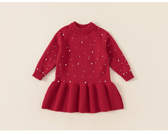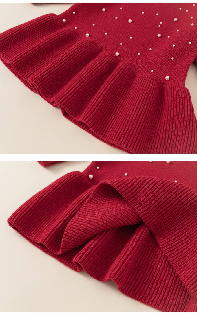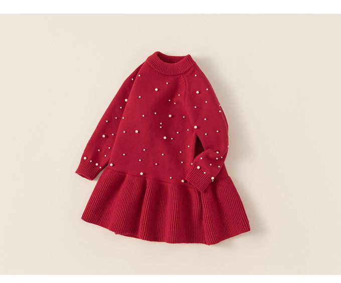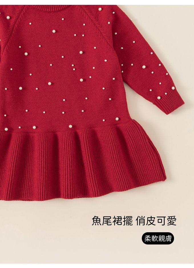 圓領針織長袖洋裝/連身裙-珍珠-紅色