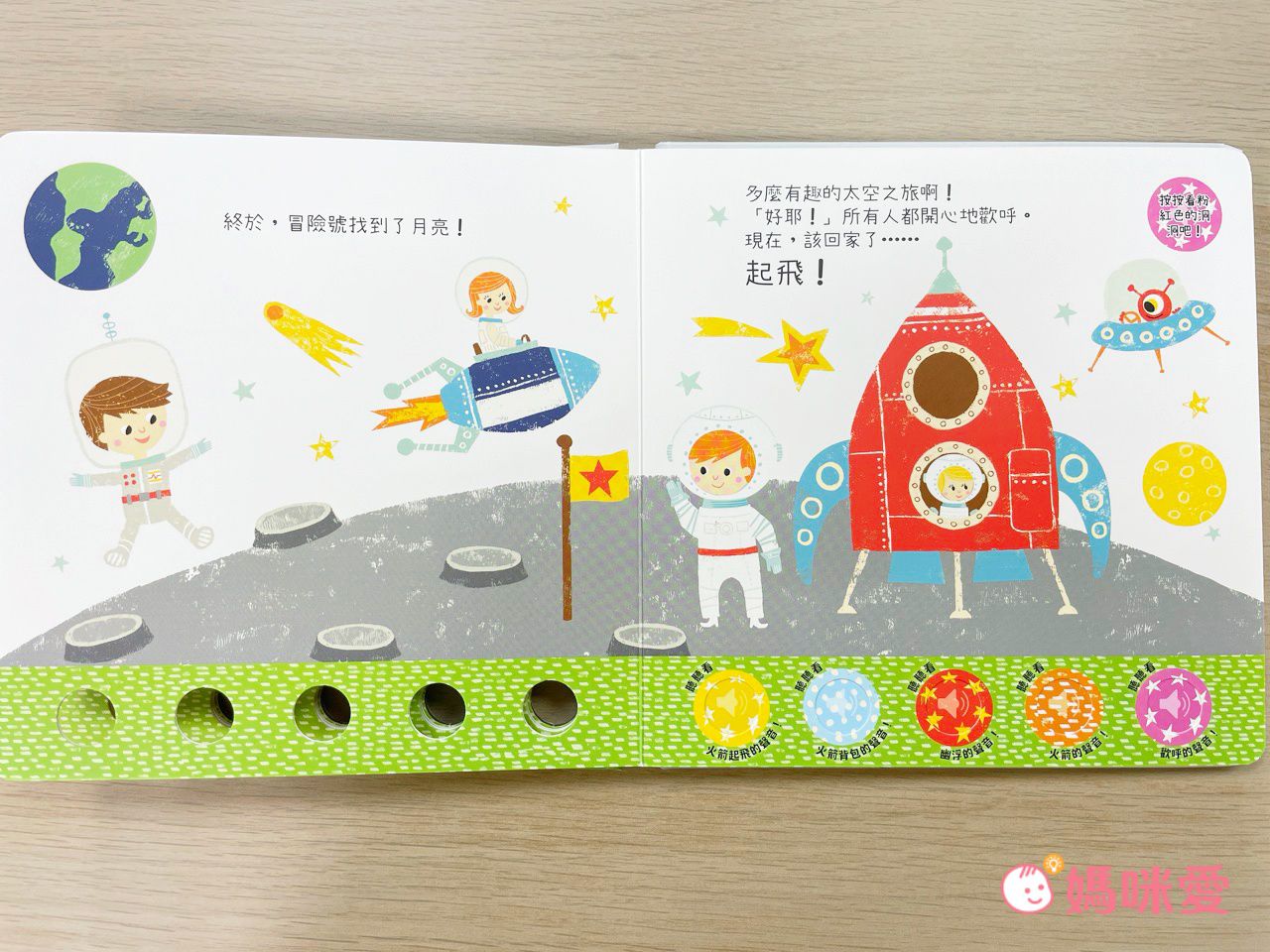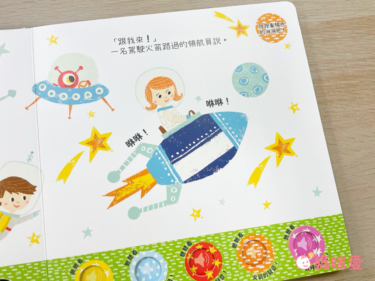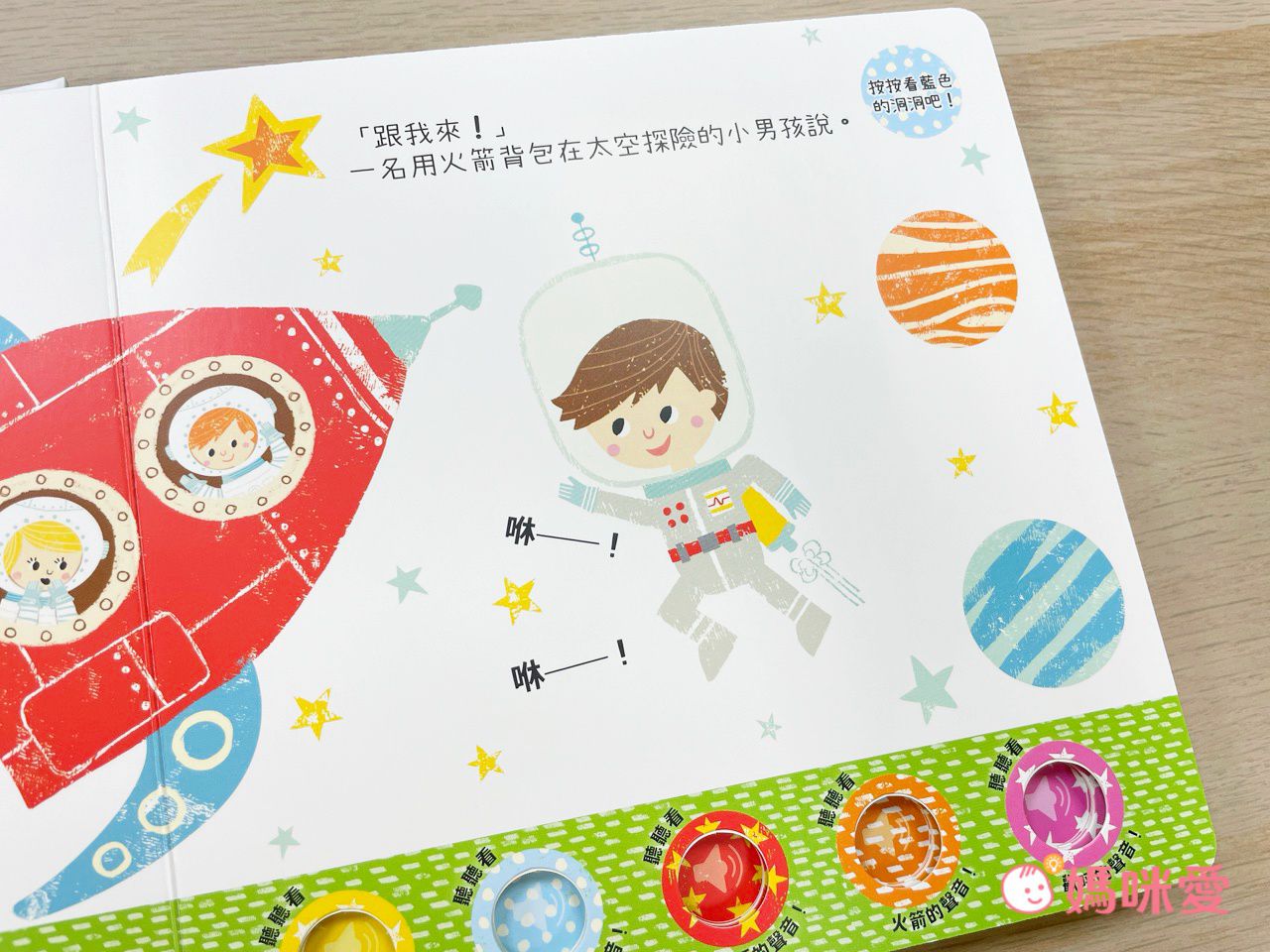 《聽!洞洞裡有聲音!》系列書,每本故事書都設計五種豐富的聲音,供孩子與正在閱讀的故事互動,只需要按下按鍵,就能夠聽見火箭起飛的聲音、外星飛船的嗶嗶聲、以及火箭背包噴射飛過太空的咻咻聲,可以帶給孩子聽覺上的刺激,幫助孩子累積感官經驗,幫助他更認識世界!
