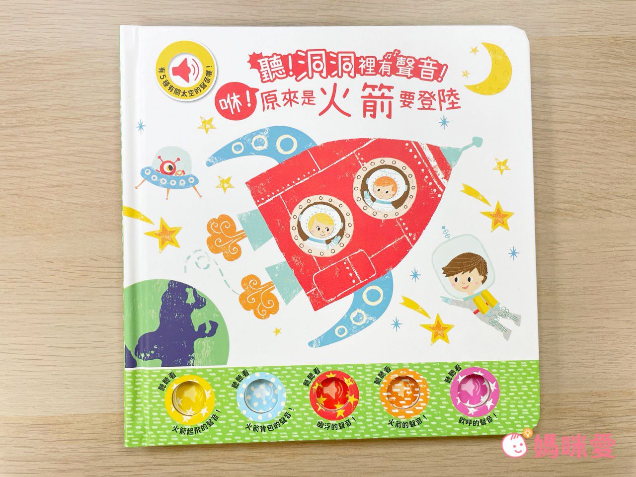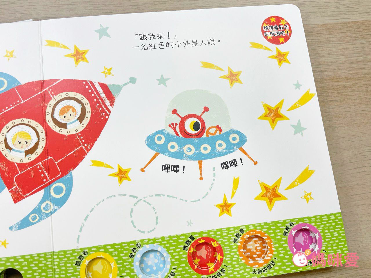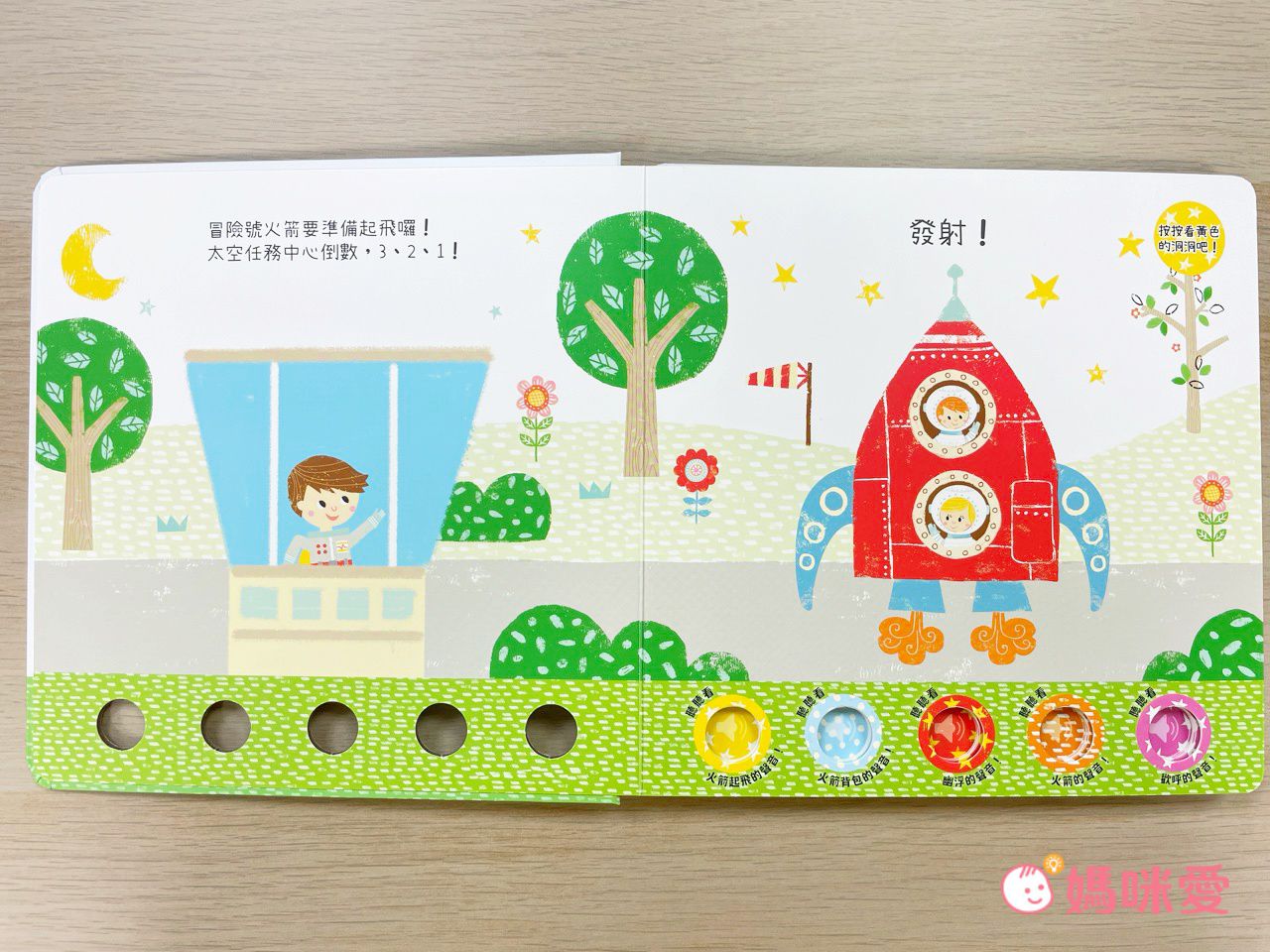 《聽!洞洞裡有聲音!》系列書,每本故事書都設計五種豐富的聲音,供孩子與正在閱讀的故事互動,只需要按下按鍵,就能夠聽見火箭起飛的聲音、外星飛船的嗶嗶聲、以及火箭背包噴射飛過太空的咻咻聲,可以帶給孩子聽覺上的刺激,幫助孩子累積感官經驗,幫助他更認識世界!