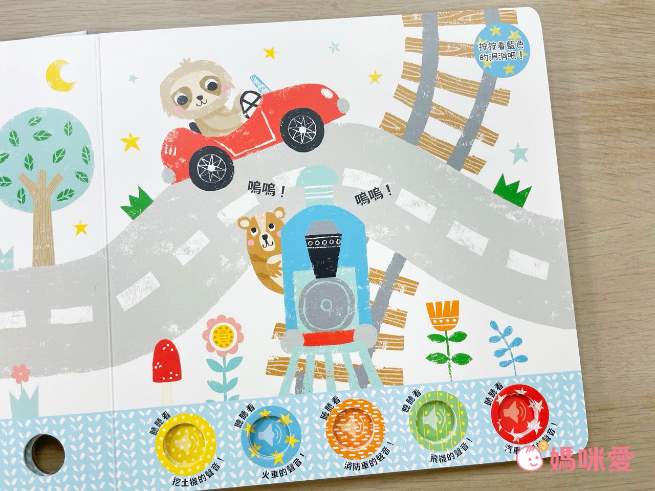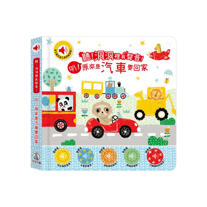 《聽!洞洞裡有聲音!》系列書,每本故事書都設計五種豐富的聲音,供孩子與正在閱讀的故事互動,只需要按下按鍵,就能夠聽見挖土機的轟隆聲音、蒸汽火車的嗚嗚聲、以及飛機快速飛過天際的咻咻聲,可以帶給孩子聽覺上的刺激,幫助孩子累積感官經驗,幫助他更認識世界!