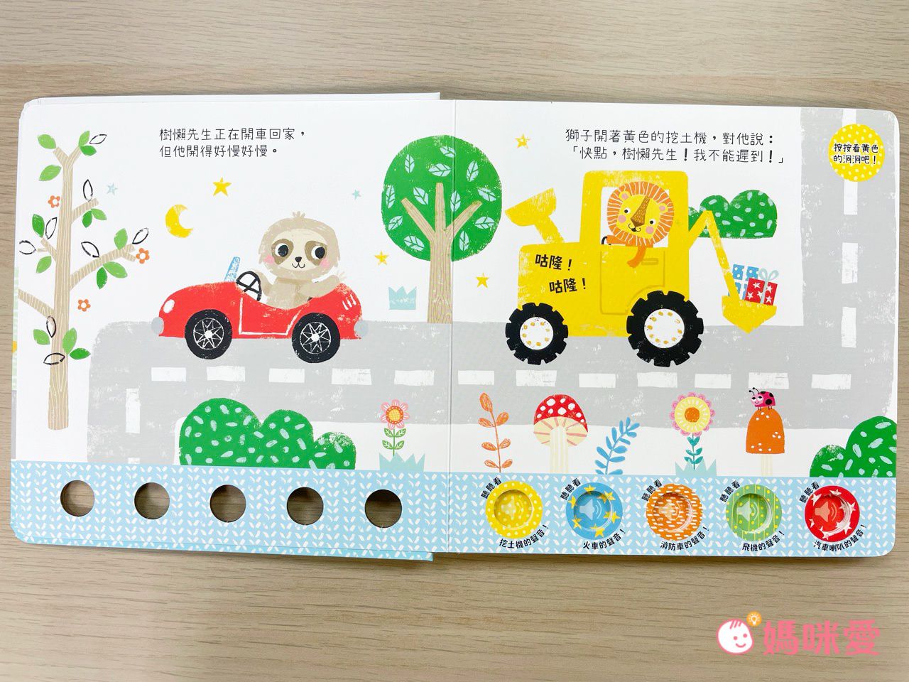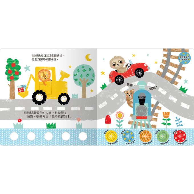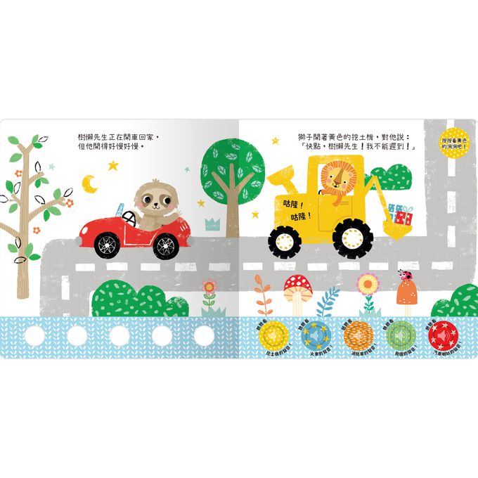 樹懶先生正在開車回家,但他開得好慢好慢⋯⋯獅子開著黃色挖土機對牠說:『快點,樹懶先生!我不能遲到』(按下黃色按鈕聽聽挖土機的聲音)
