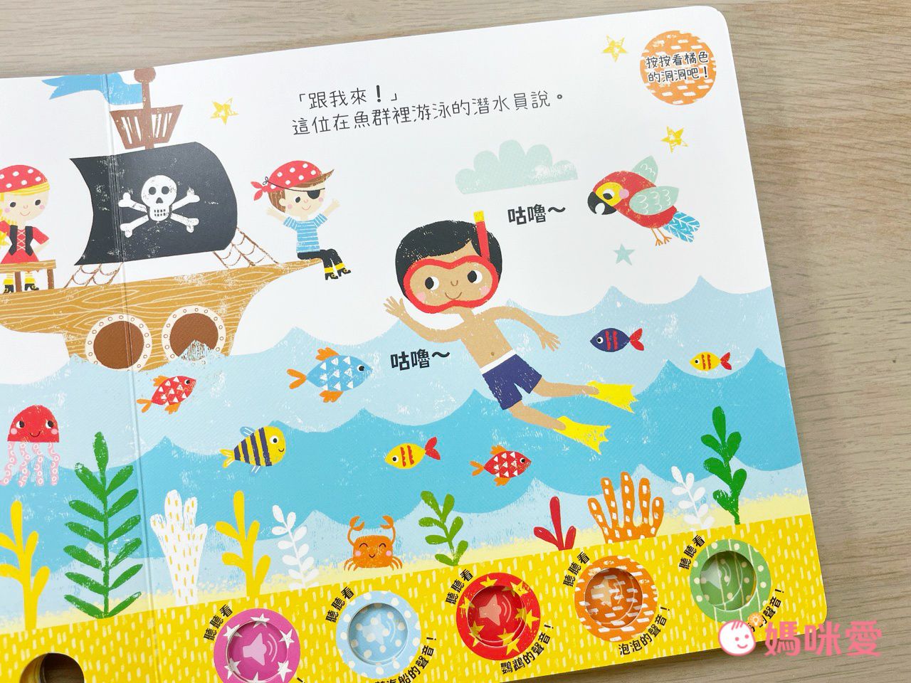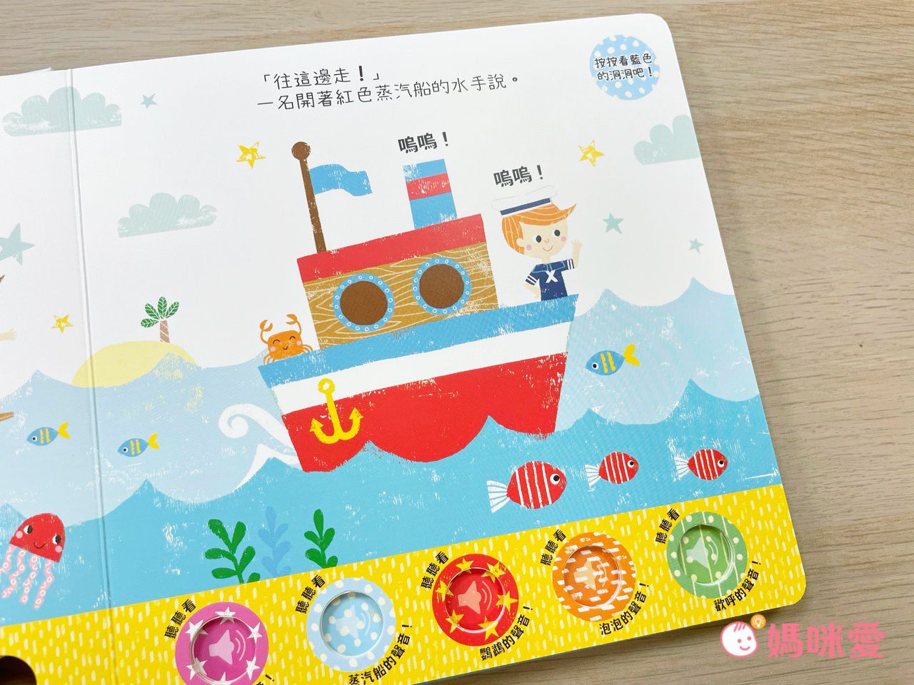 《聽!洞洞裡有聲音!》系列書,每本故事書都設計五種豐富的聲音,供孩子與正在閱讀的故事互動,只需要按下按鍵,就能夠聽見海浪的聲音、蒸汽船鳴響的轟鳴聲、以及魚群在水下吐出泡泡的環境聲,可以帶給孩子聽覺上的刺激,幫助孩子累積感官經驗,幫助他更認識世界!