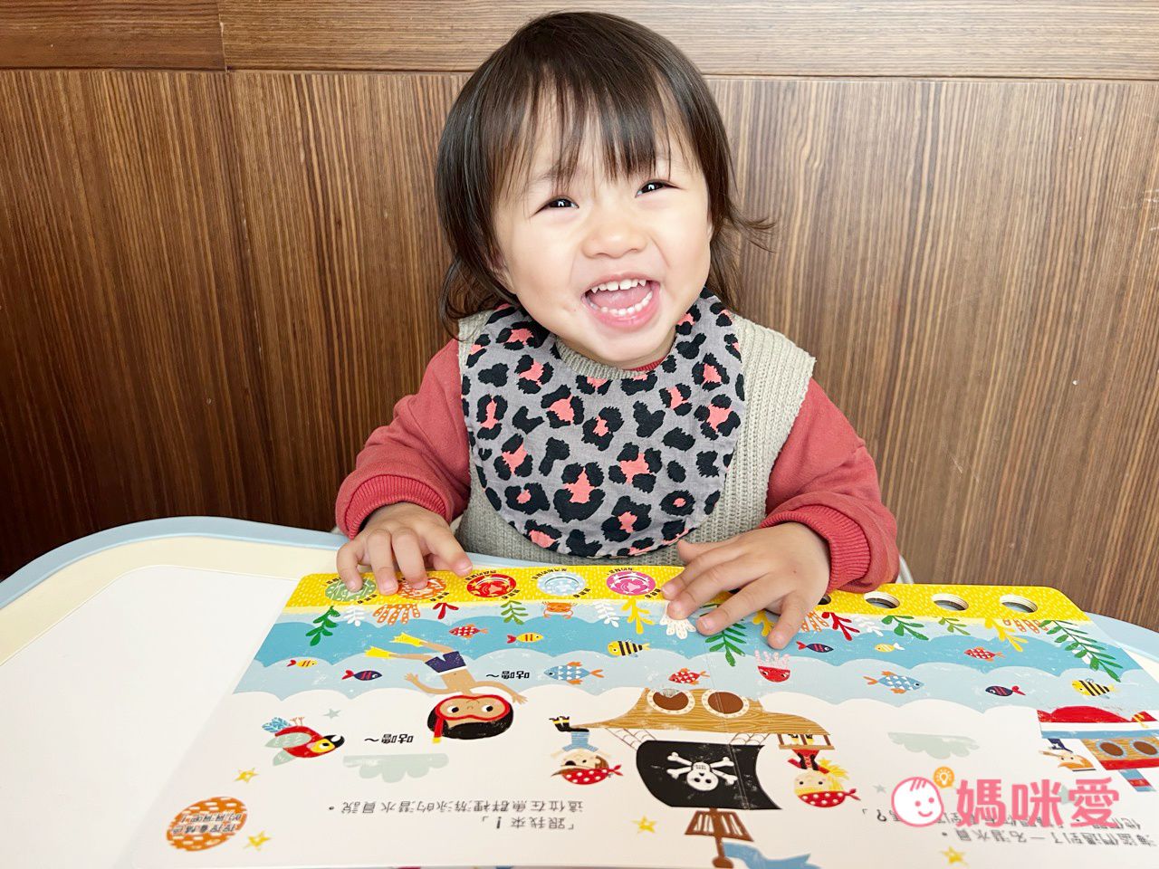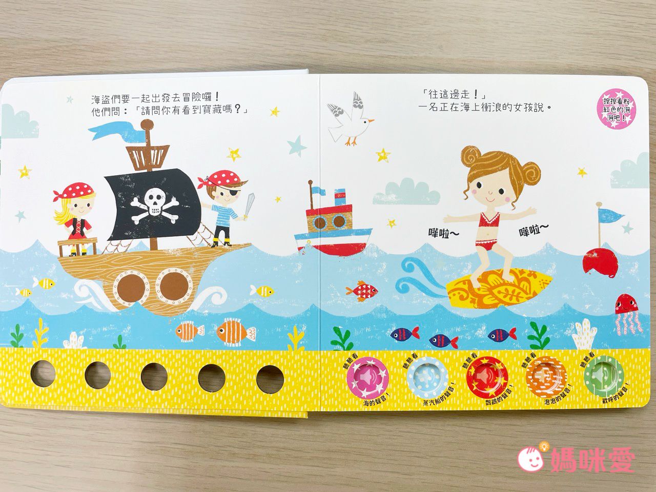姍姍每看一本書,就馬上朝著大大的圓圈按下去。每頁的圓圈顏色都有清楚配對。此外音質很好!能夠聽清楚蒸汽船的轟鳴聲、魚在水裡吐泡泡的聲音、甚至是海浪的聲音,讓孩子更了解故事情境。推薦給學齡前的孩子們,促進五感發展!