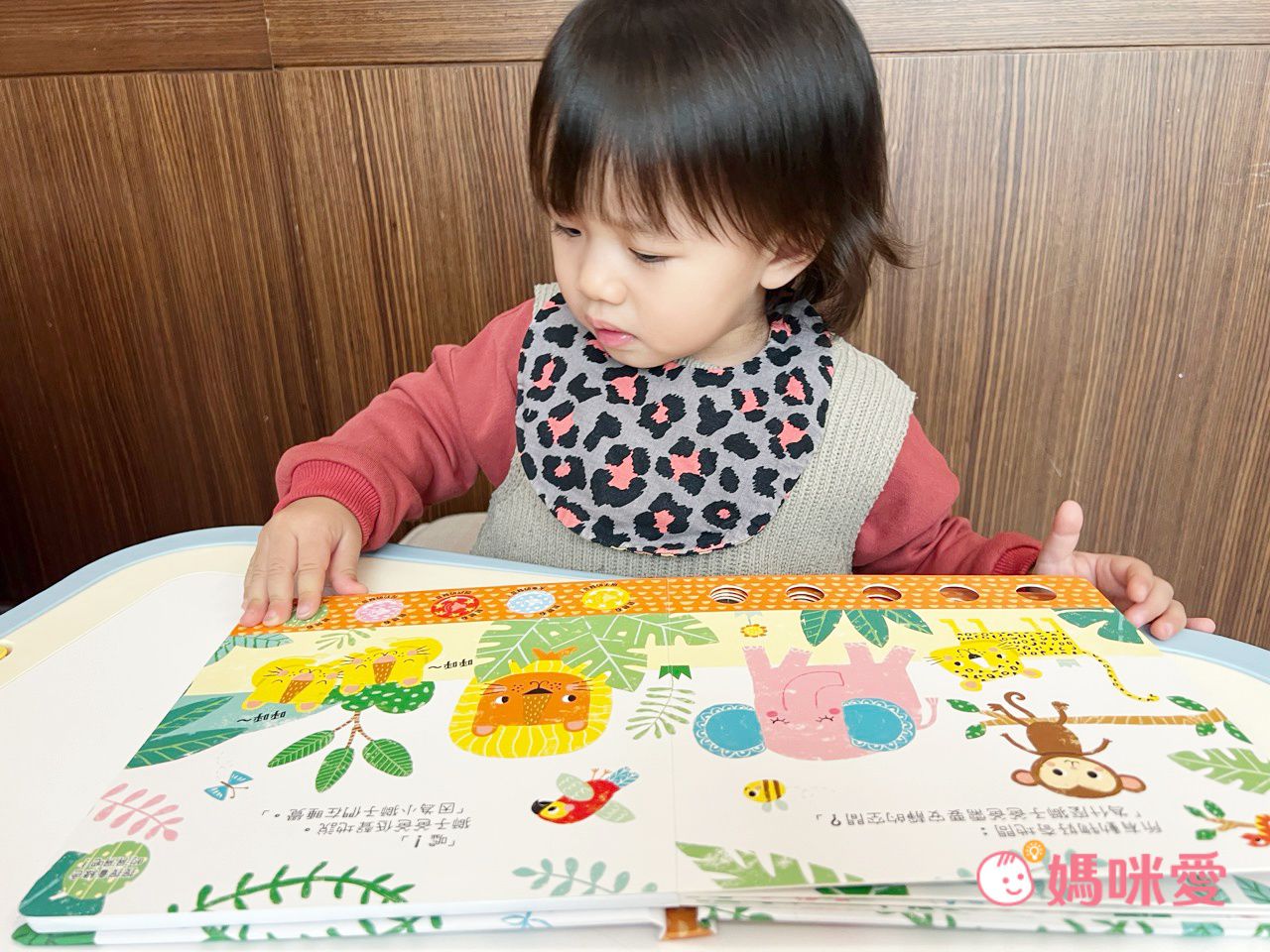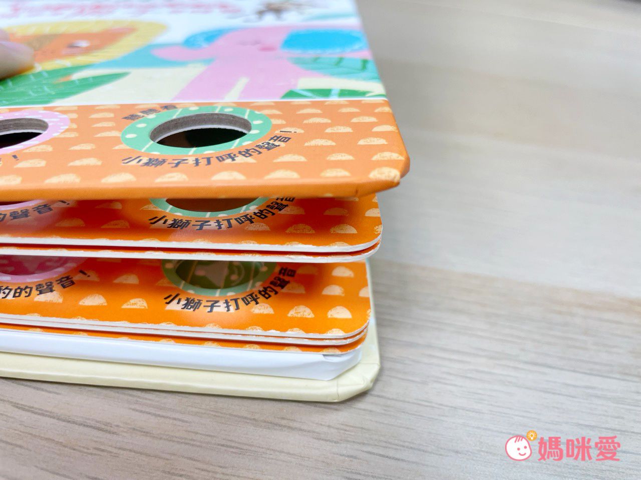 這系列的特色就是那5種豐富的聲音,只要按下按鍵就能聽見猴子聊天的聲音、鸚鵡在叢林裡高歌的嘎嘎聲以及大象喝水嬉戲的吵鬧聲,可以帶給孩子聽覺上的刺激,累積感官經驗。