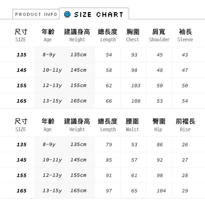 1. 尺寸表單位皆為公分(cm),實際尺寸會因布料彈性、水洗、測量起迄點等因素略有誤差。建議參考孩子平時穿著衣物尺寸進行選購。