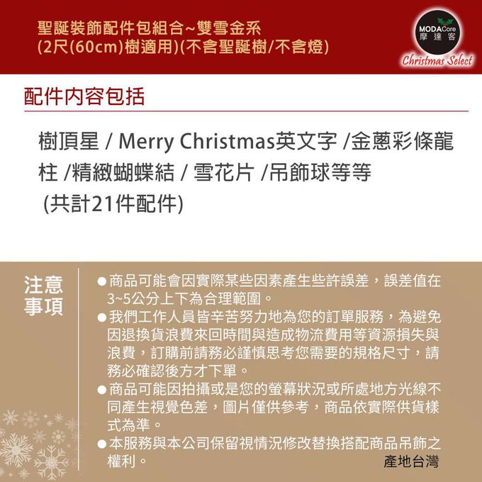 品名:聖誕裝飾配件包組~雙雪金系(2尺樹適用)(不含聖誕樹/不含燈)