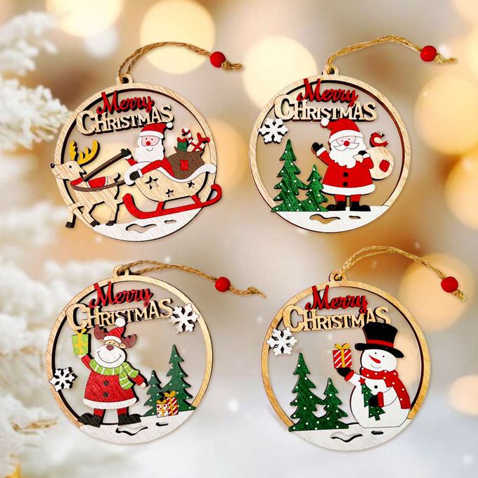 可愛質感木質圓形吊飾(單面)-聖誕老公公+雪人+麋鹿4入組