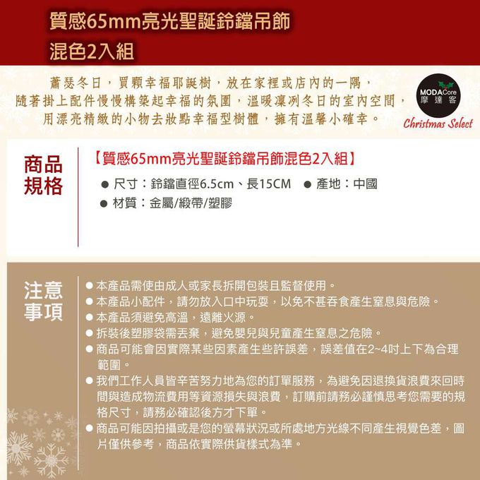 品名:質感65mm亮光聖誕鈴鐺吊飾混色2入組