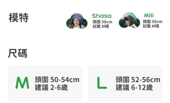 M(頭圍50-54公分,建議2-6歲)、L(頭圍52-56公分,建議6-12歲)
