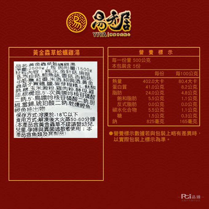 成分:雞.水.金針菇.珊瑚菇.秀珍菇.鮑魚菇.香菇.杏鮑菇.中蛤.薑.紅棗.米酒.紹興酒.黃金蟲草子實體.鹽.麥芽糊精.L-麩酸鈉.糖.玉米澱粉.雞肉粉.酵母.雞油.棕櫚油.5'–次黃嘌呤核苷磷酸二鈉.5'–鳥嘌呤核苷磷酸二鈉.胡椒.當歸.琥珀酸二鈉.乾燻鰹魚.鰹魚抽出物