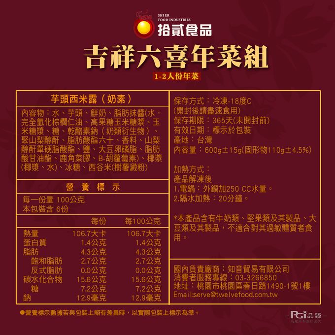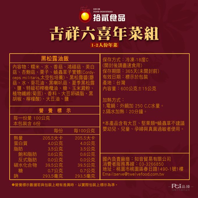 商品重(容)量:黑松露油飯:600g±15g 橙汁排骨:400g±3% 栗子烤麩煨銀杏(素):200g±9g 干貝花膠津白雞湯:600g±15g(固形物150g) 禧菇角燒嫩雞:600g±15g(固形物280g±9g) 芋頭西米露(奶素):600g±15g(固形物110g±4.5%)