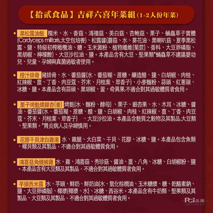 成分:黑松露油飯:糯米、水、香菇、鴻禧菇、美白菇、杏鮑菇、栗子、蛹蟲草子實體(Cordyceps miltaris,太空包培養)、松露醬(蘑菇、水、葵花油、黑喇叭菇、夏季黑松露、鹽、特級初榨橄欖油、糖、玉米澱粉、植物纖維(菊苣)、香料、大豆卵磷脂、黑胡椒、檸檬酸)、大豆沙拉油、鹽。 橙汁排骨:豬排骨、水、番茄醬(水、番茄糊、蔗糖、釀造醋、鹽、白胡椒、肉桂、紅辣椒、薑、丁香、肉豆蔻、芥末、月桂葉、眾香子)、小麥麵粉、蒜頭、紅蔥頭、冰糖、鹽。 栗子烤麩煨銀杏(素):烤麩(水、麵粉、酵母)、栗子、銀杏果、水、木耳、冰糖、醬油、番茄醬(水、番茄糊、蔗糖、醋、鹽、白胡椒、肉桂、紅辣椒、薑、丁香、肉豆蔻、芥末、月桂葉、眾香子)、大豆沙拉油。 干貝花膠津白雞湯:水、雞腿、大白菜、干貝、花膠、冰糖、鹽。 禧菇角燒嫩雞:水、雞、鴻喜菇、秀珍菇、醬油、薑、八角、冰糖、白胡椒粉、鹽。 芋頭西米露(奶素):水、芋頭、鮮奶、鮮奶油(水、氫化棕櫚油、玉米糖漿、糖、乾酪素鈉、鹽、大豆卵磷脂)、椰漿(椰漿、水)、冰糖、西谷米。